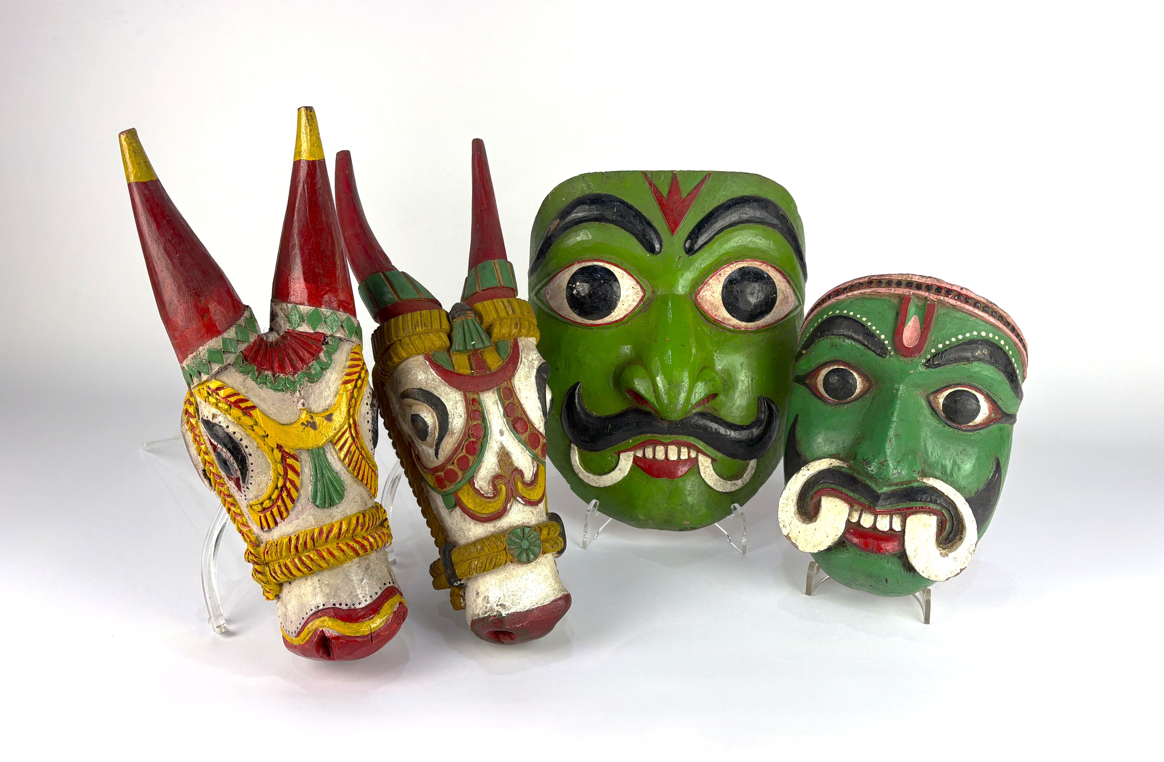 Four Indian carved and painted wall masks to include a pair of carved and painted 'Nandi Head' Indian cow wall hangings 29cm high