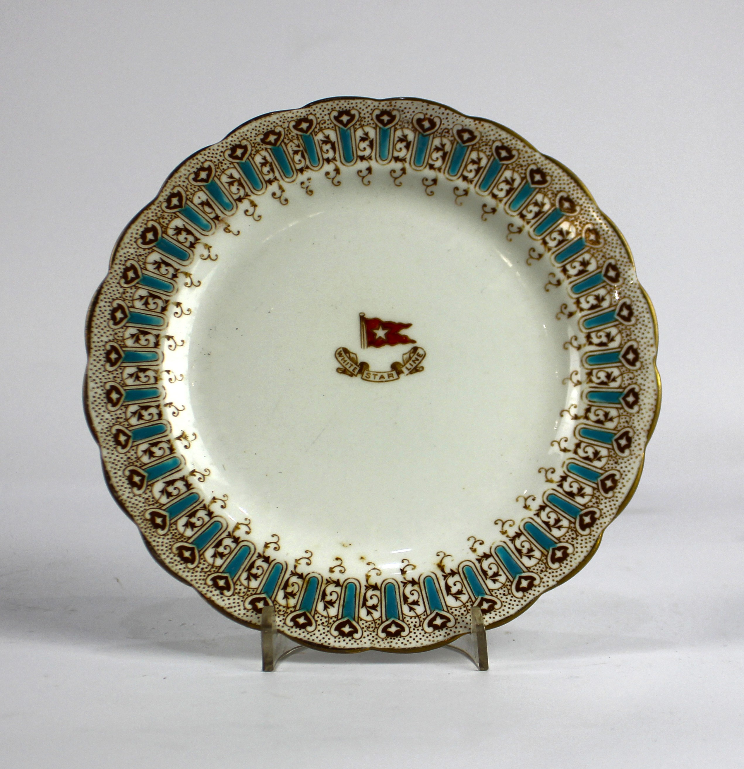 Maritime: An early 20th century White Star Line side plate, marked to base 'Stonier & Co. Ltd., Liverpool' and Rd No 117214 and Rd No 324028, with shaped rim, decorated with repeating band and centrally with White Star Line flag and banner, diameter 19.75cm
