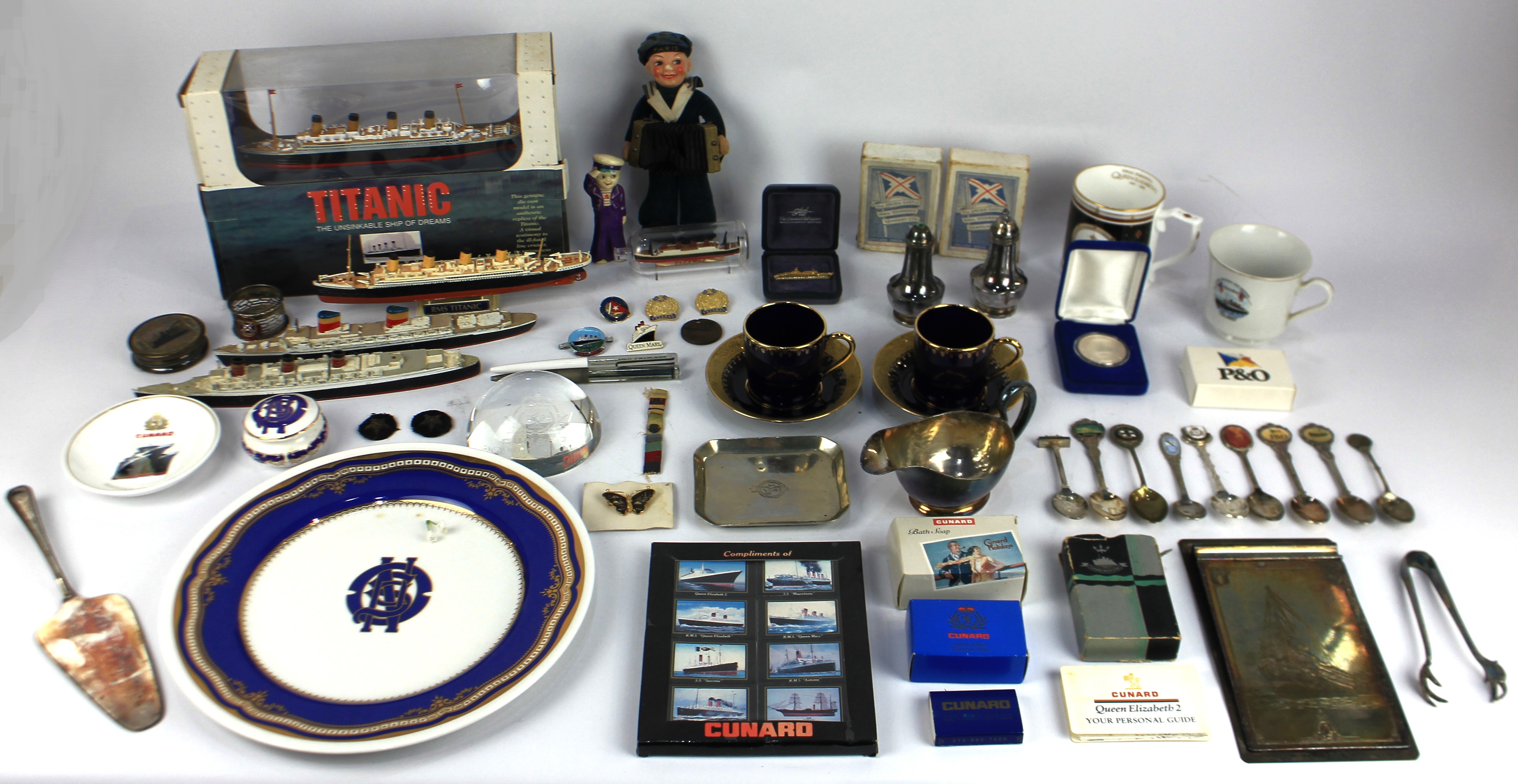 Martime: A collection of ocean liner related memorabilia, 20th century, including; a contemporary RMS Titanic collectors plate and lidded pot, two packs of Union Castle playing cards, a pack of Cunard/ White Star playing cards, a pack of P&O playing cards, a Norah Wellings type sailor doll and a further sailor figure, two Cunard boxed handsoaps, a pair of Queen Elizabeth II coffee cans and saucers, a QE2 mug, a collection of pin badges, a silver plated RMS Edinburgh Castle napkin ring, a Mauritania commemorative coin and another coin, a Cunard paperweight, nine silver plated souvenir spoons for a variety of shipping lines, four model liners and a ship in a bottle, a Cunard Steamship plated dish, a pair of P&O sugar tongs, a Nederhard desk stand and a Mappin & Webb silver plated salt and pepper pot (qty)