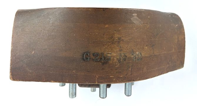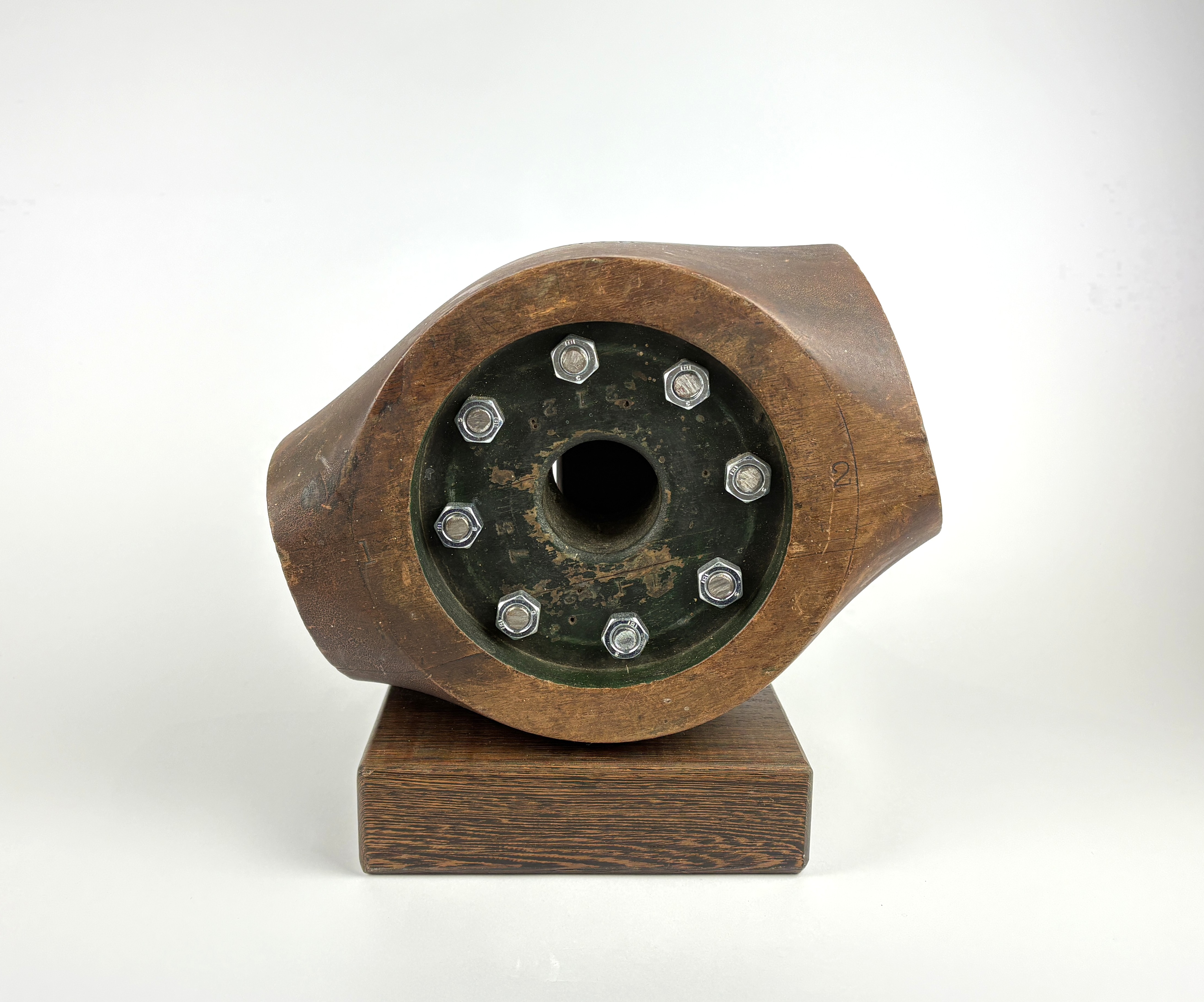 A First World War wooden propeller boss stamped G 215N 72, with new bolts, mounted on a contemporary wooden stand, 27cm high including stand