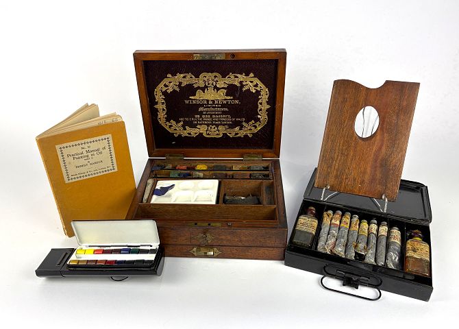 A 19th century Windsor & Newton artists' box with drawer, ceramic palette and key, together with two artists' tins with contents