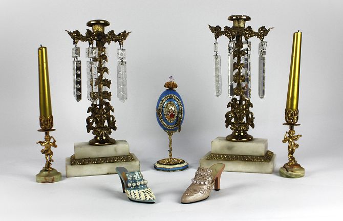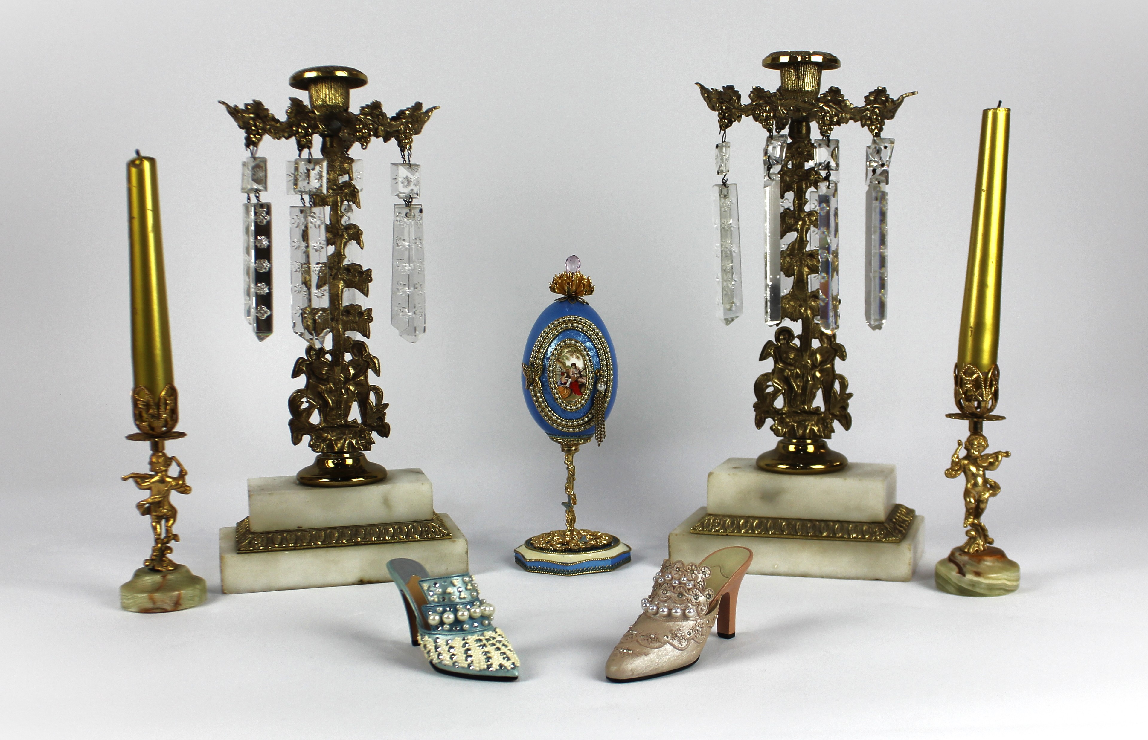 A pair of brass and gilt metal lustre candlesticks, with floral and vine leaf motif stem and surround, on stepped marble base, height 32cm, together with a pair of Azizoff of London onyx and gilt metal candlesticks, height 13.5cm, a decorative egg and two decorative slippers (7)