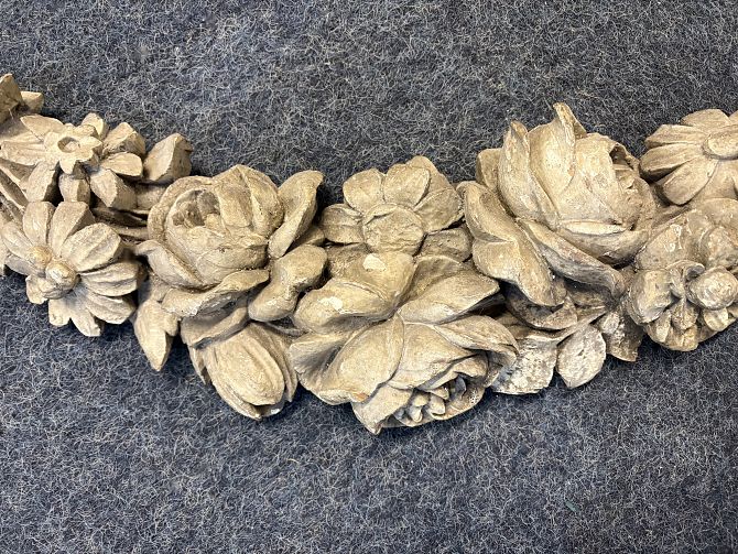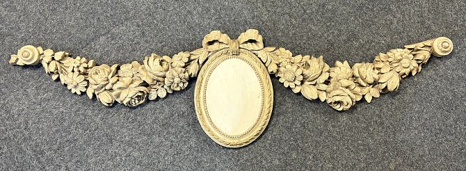 A French carved wood decorative floral swag the central oval panel with ribbon surmount, mounted for wall display, 145cm long