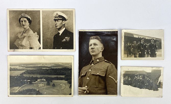Royal & Military: Two black and white candid photographs of the Prince of Wales (later Edward VIII) visiting Portsmouth 28th March 1935, together with a postcard (possibly Asdean House Estate) multi signed verso by Pamela Mountbatten, Patricia Mountbatten and members of the staff at Asdean, and a Second World War Christmas George VI and Queen Elizabeth postcard, bearing printed signature and inscription verso, and a futher military postcard (5)