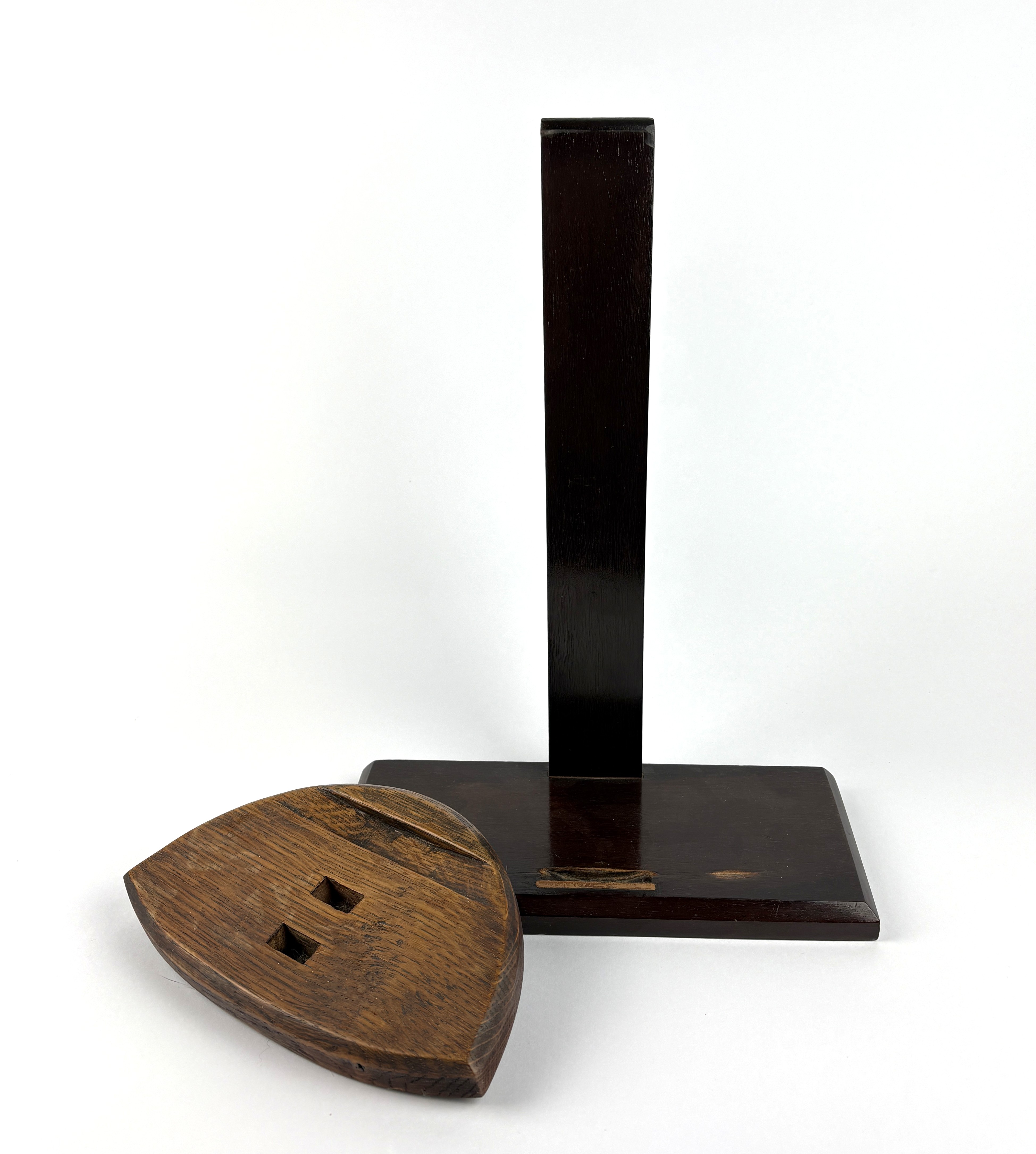 A vintage wooden plate display stand, Georgian style but early 20th century, 31cm high, together with another similar period wooden stand, (2).