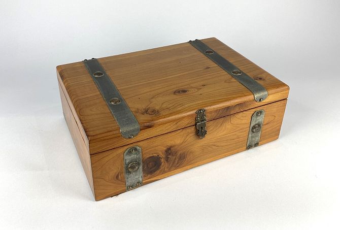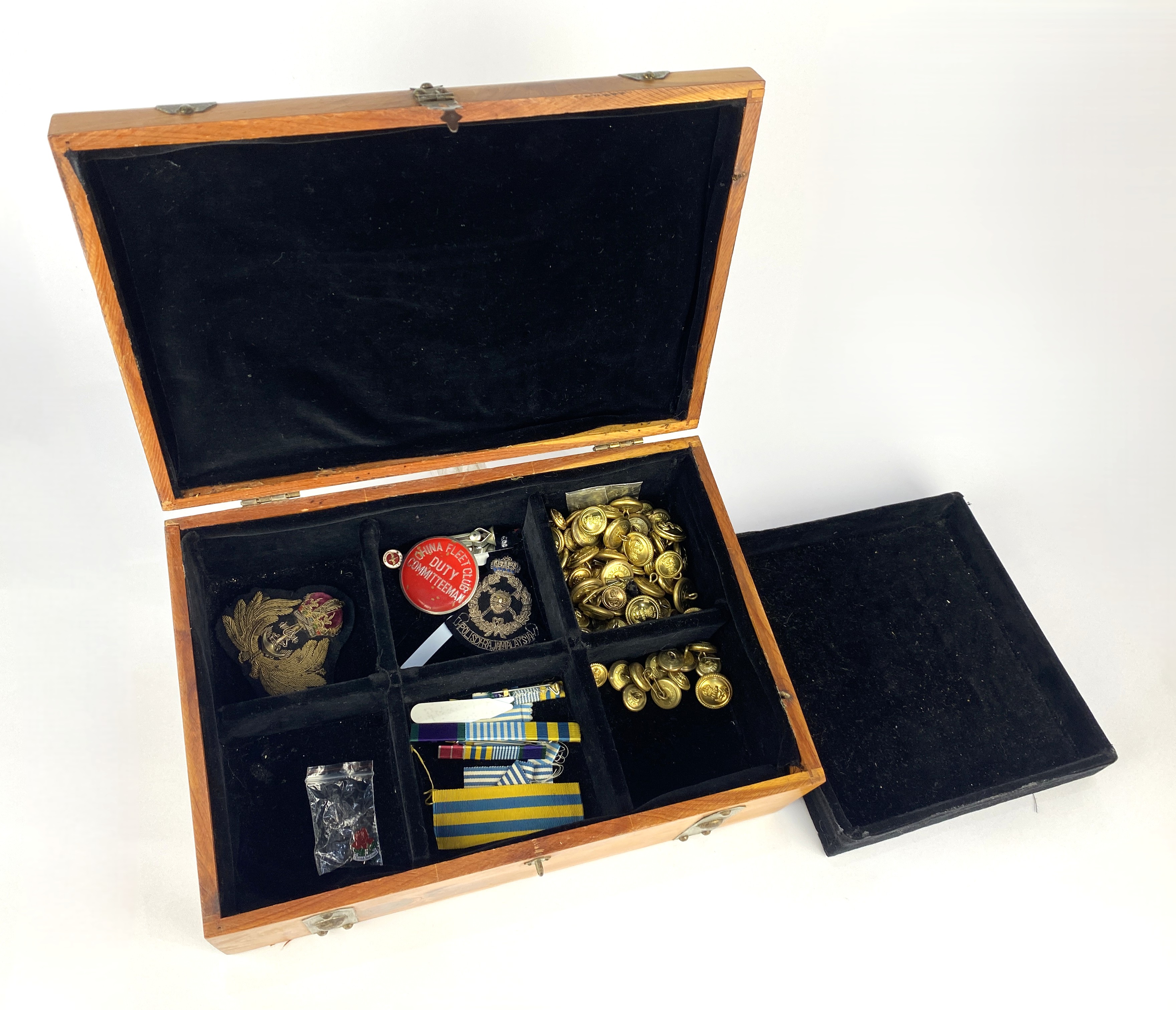 A collection of Royal Navy brass buttons, and a small quantity of badges, housed in a metal bound wooden jewellery box