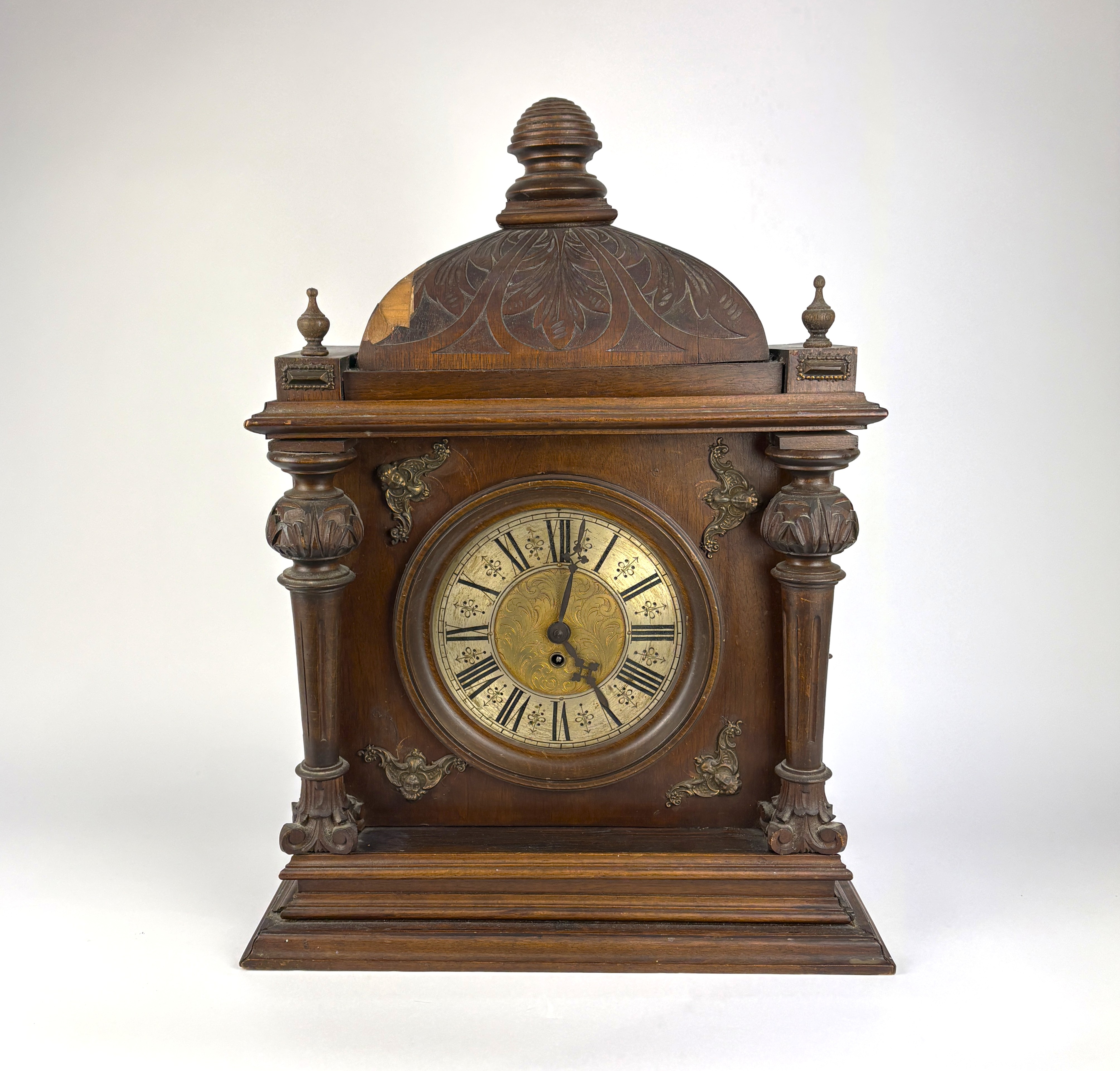 A large German mantle clock with carved wood architectural case, the silvered chapter ring with Roman numerals, 61cm high