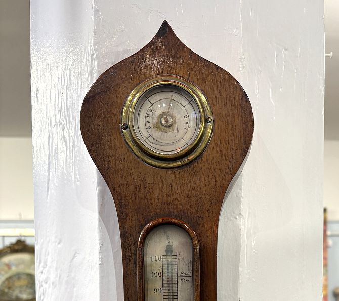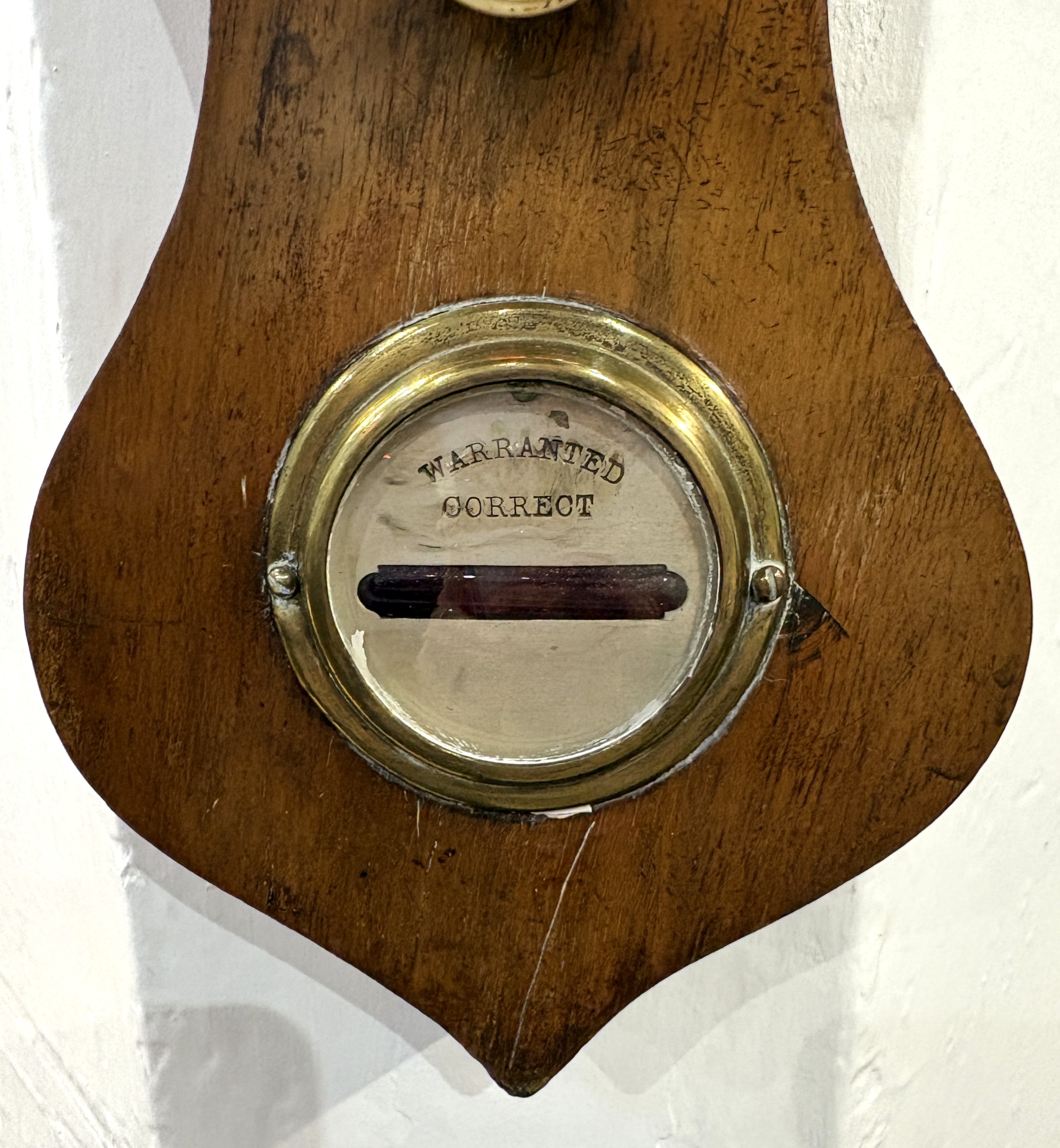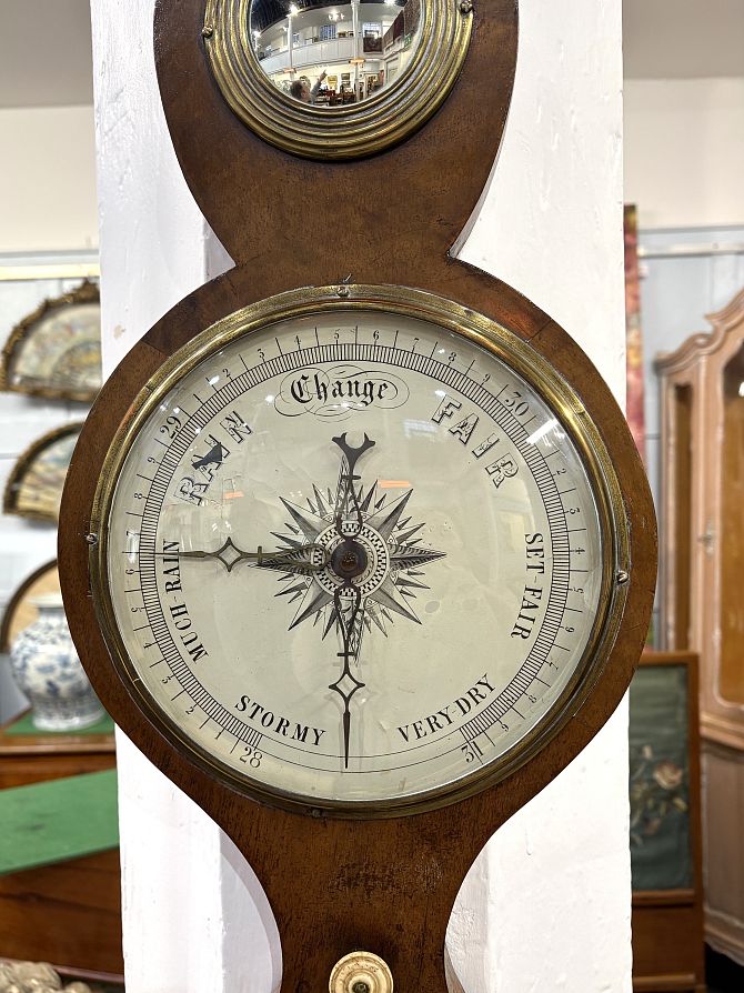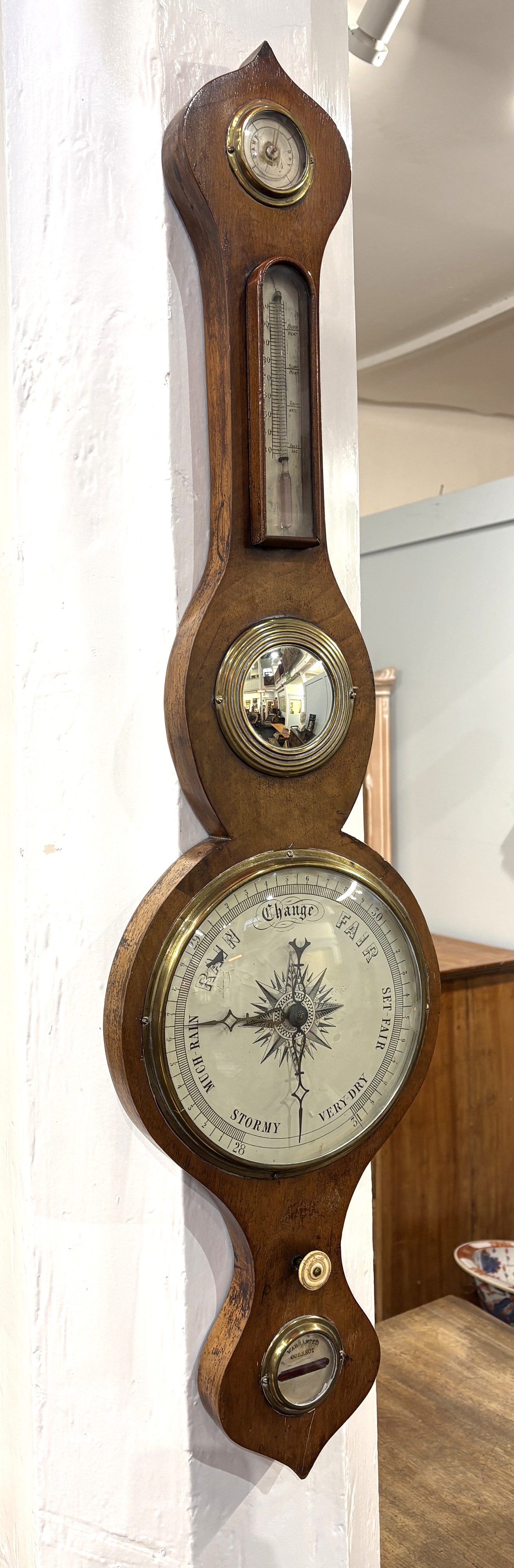 A 19th century 'onion top' mahogany cased barometer, with thermometer, hydrometer, and spirit level guages, and a small circular inset convex mirror, 95cm high, (af).