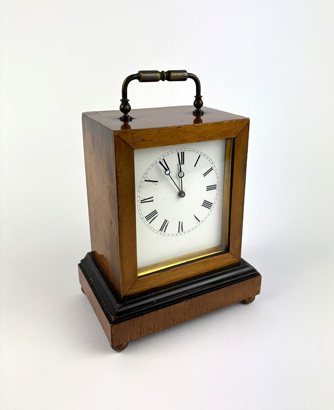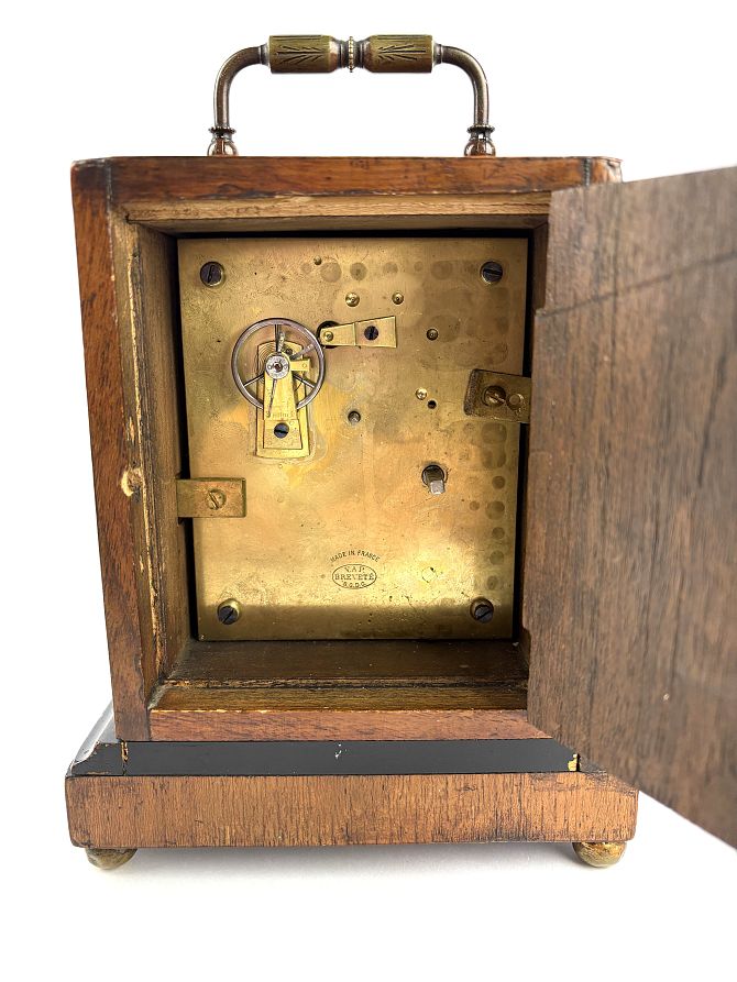 A 19th century French rosewood cased mantle clock / carriage clock, with hinged carrying handle, white enamel dial, and brass bun feet, the movement stamped 'V.A.P. BREVETE S.G.D.G.', 17cm high.