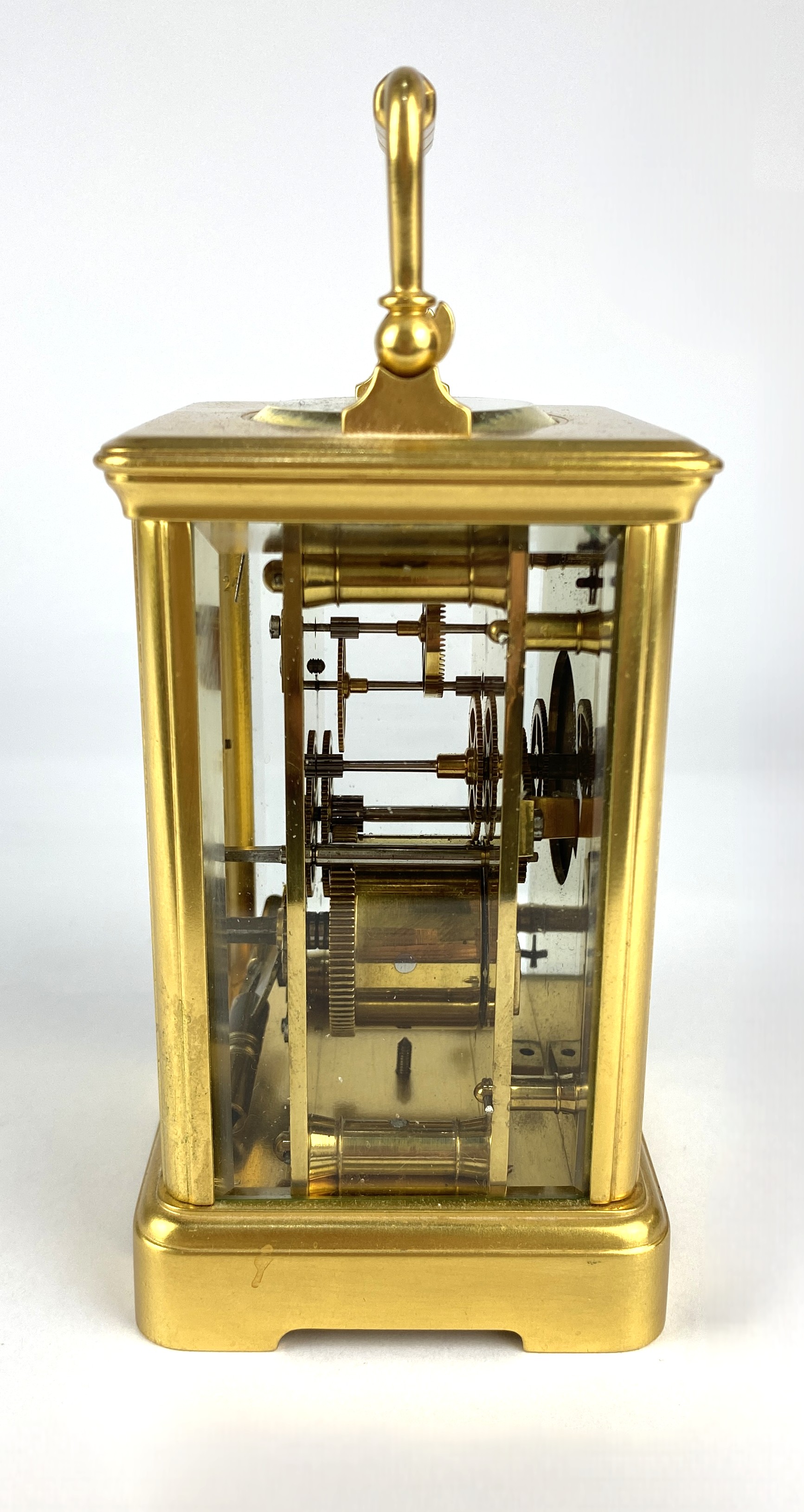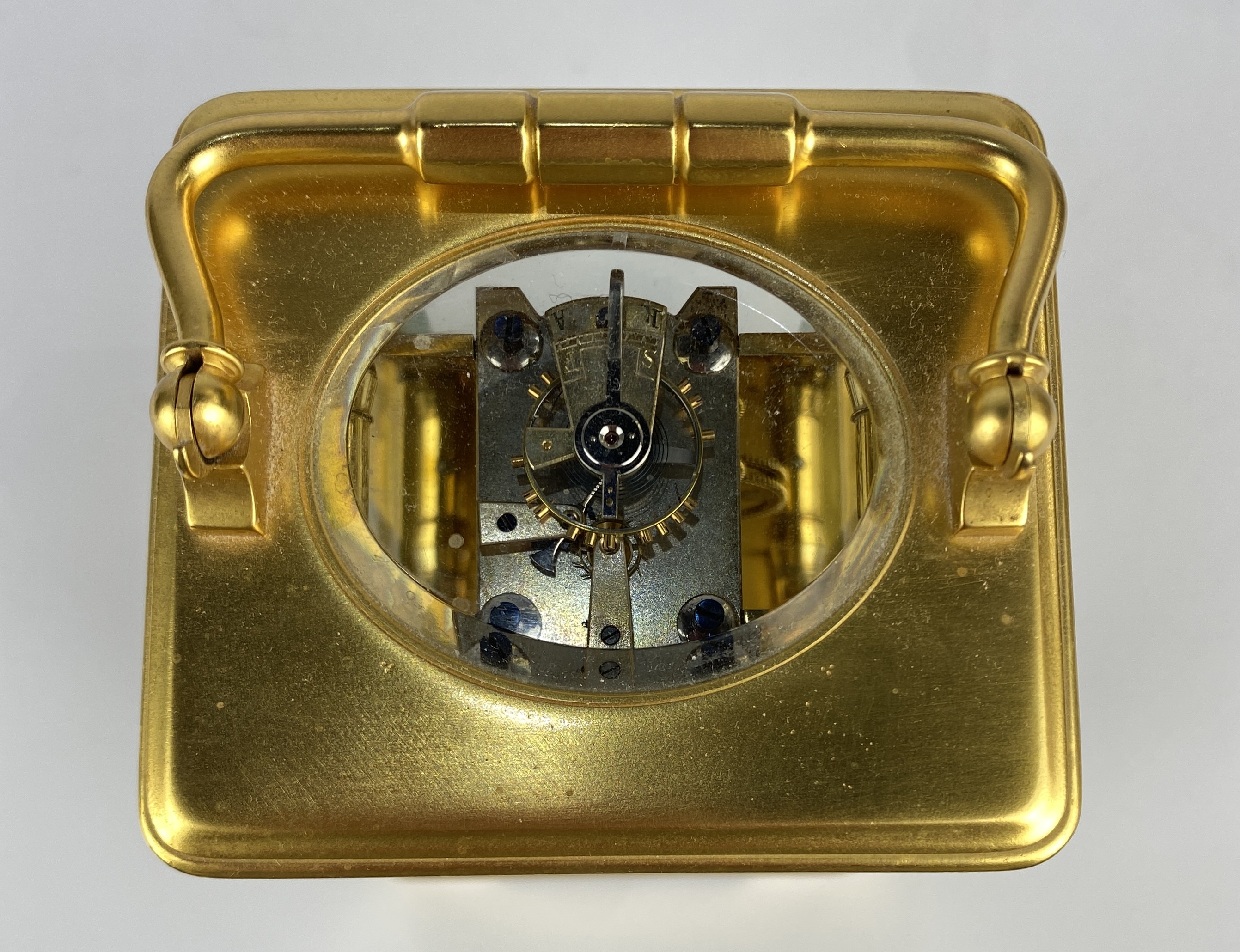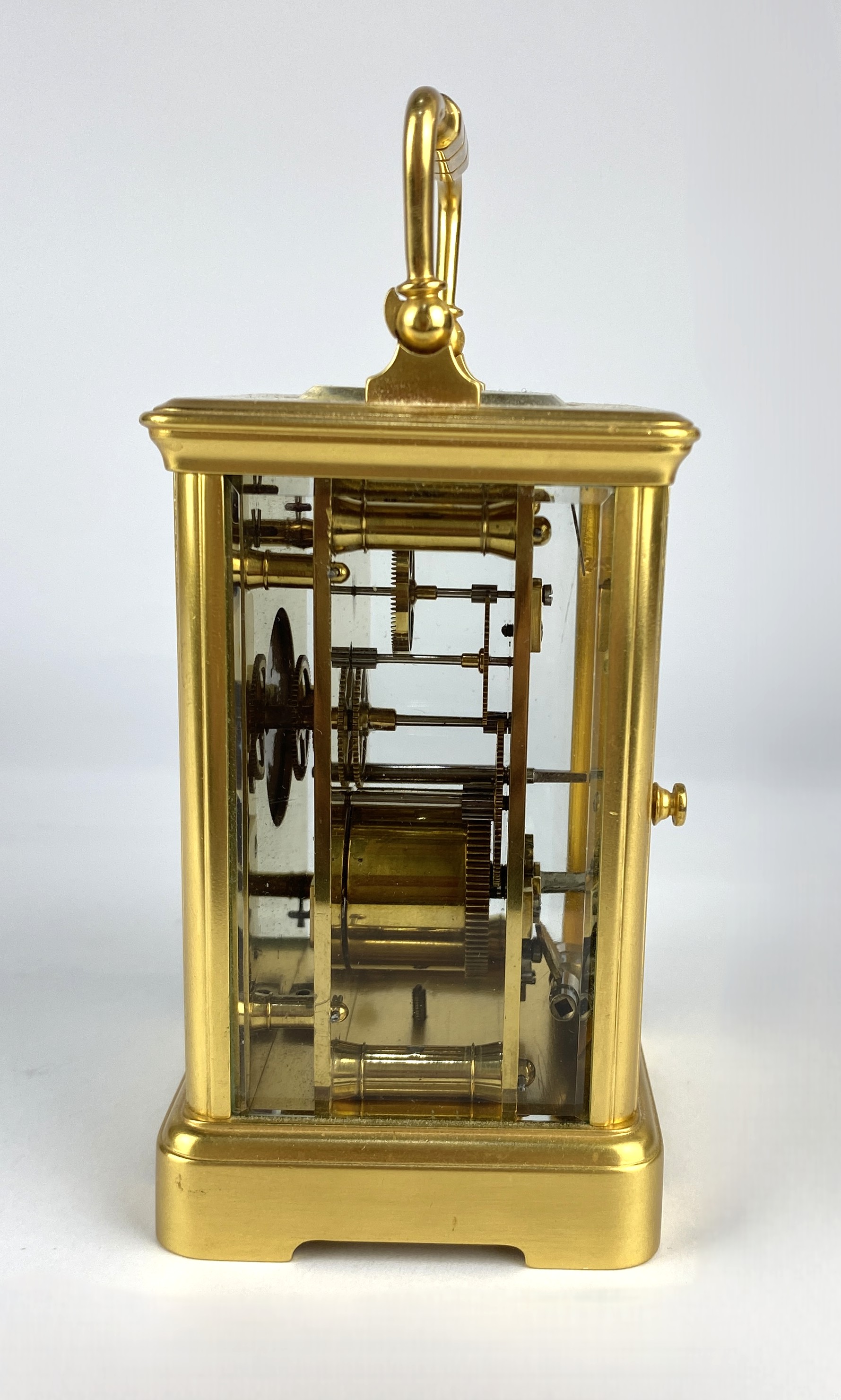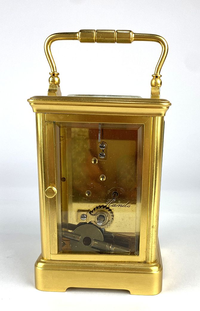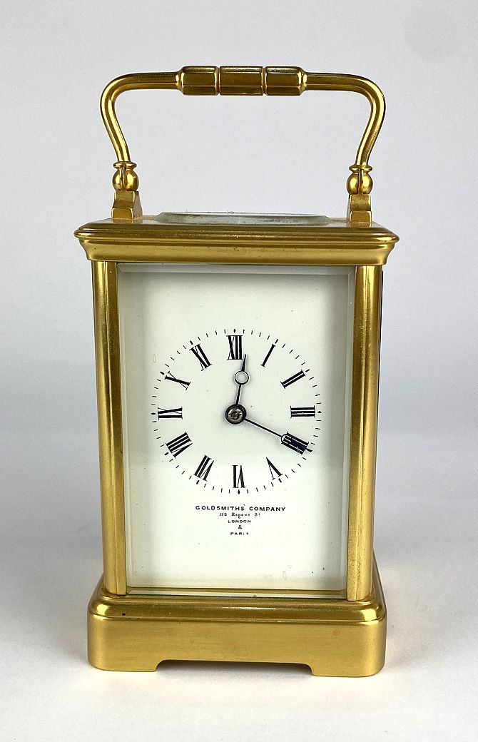 A 20th century gilt brass and bevelled glass cased carriage clock, the white enamelled dial with Roman numerals and marked 'Goldsmiths' Company 112 Regent Street, London & Paris', 18cm high including handle, with key