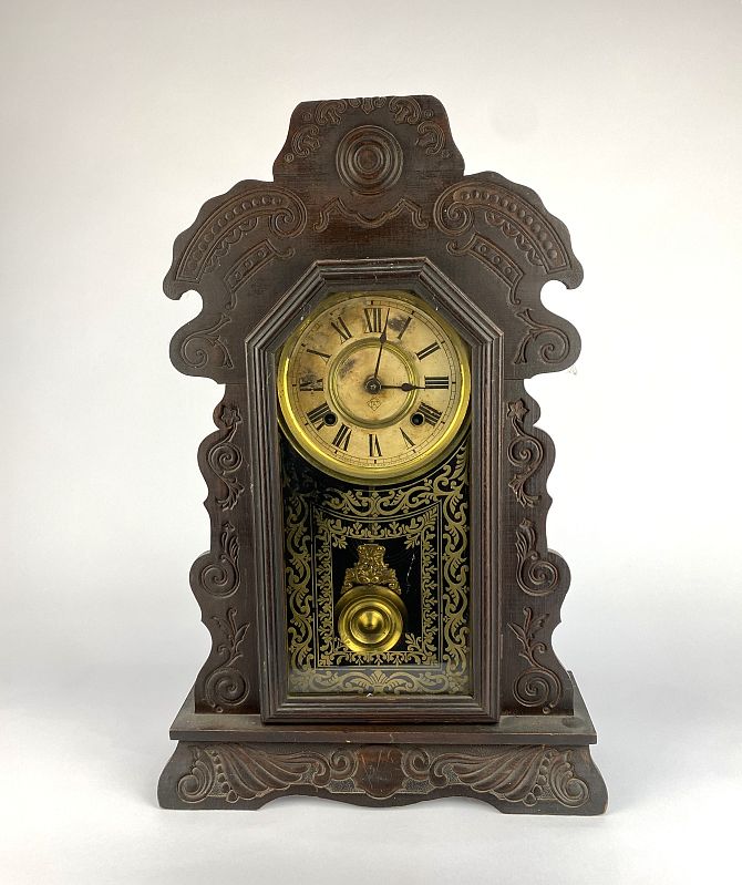 An early 20th Century American Ansonia 'Gingerbread' mantle clock, striking on a gong, 55cm high, no key (a/f)