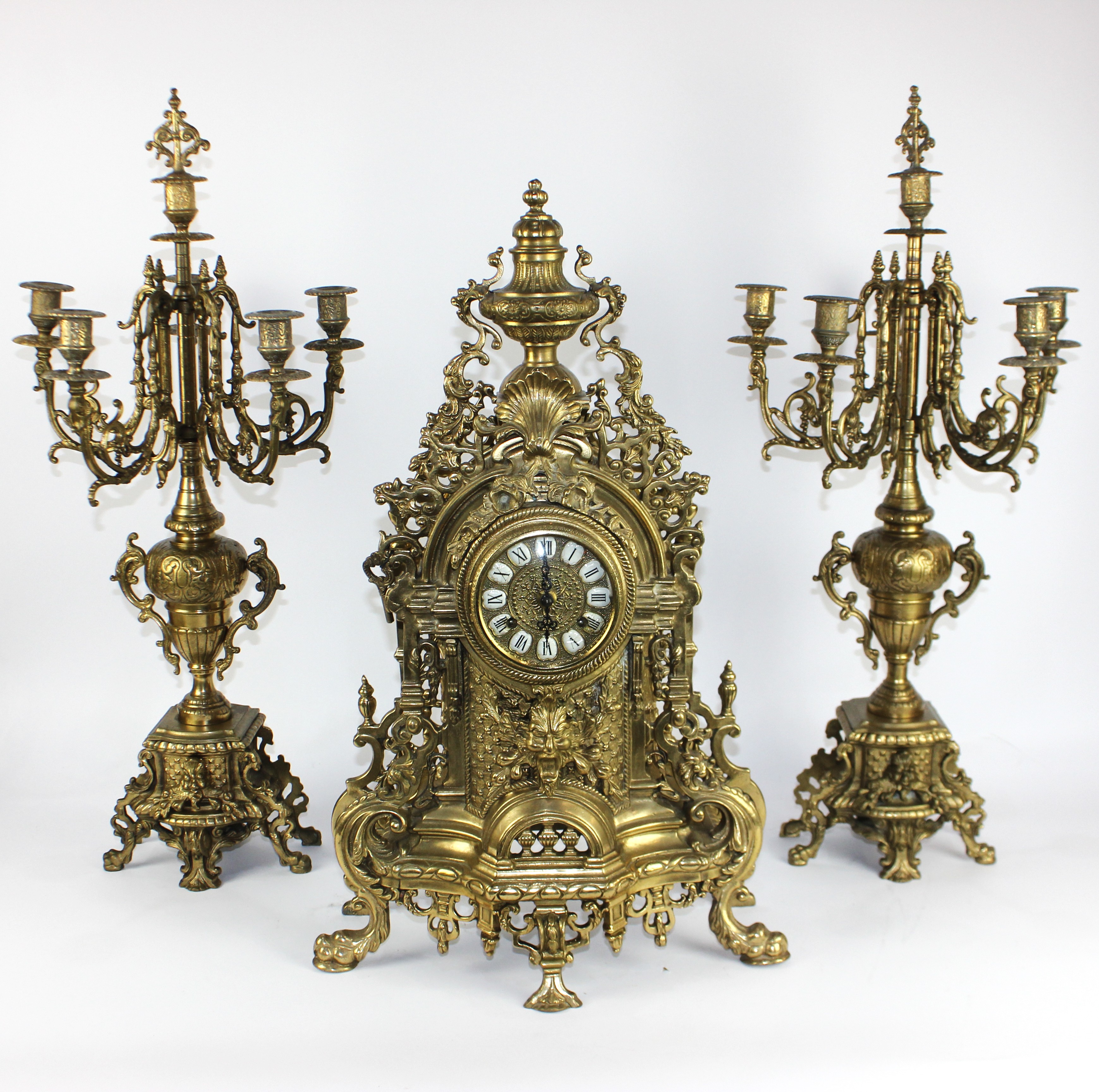 A 20th Century German rococo style brass mantle clock garniture, striking to a bell, height 61cm, with two five branch candelabras, height 68cm