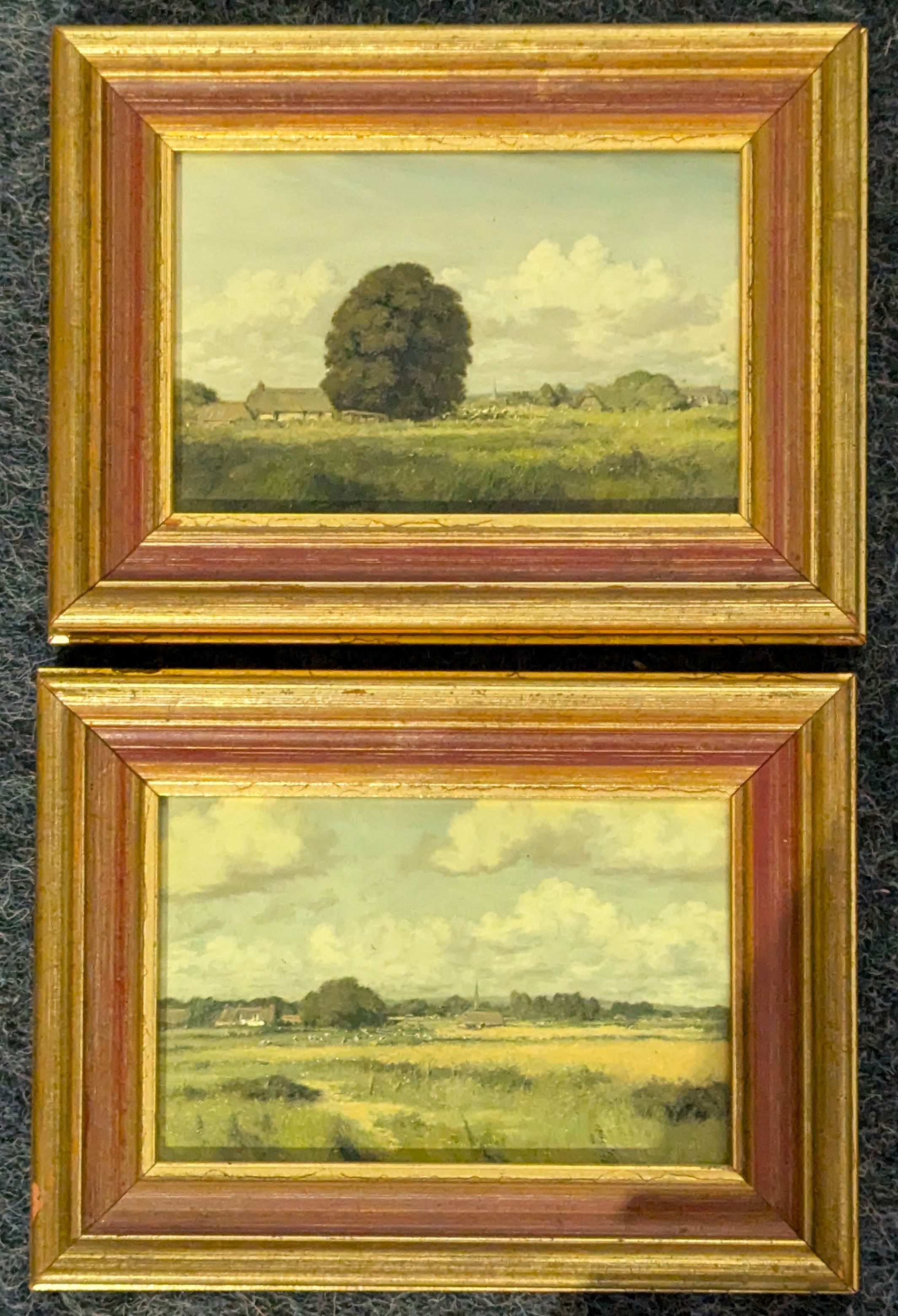 Oliver Ommanney, two small landscape views with Chichester Cathedral in the distance, 'Near Chichester', both oil on board, unsigned, verso inscribed, 8.5cm by 13.5cm