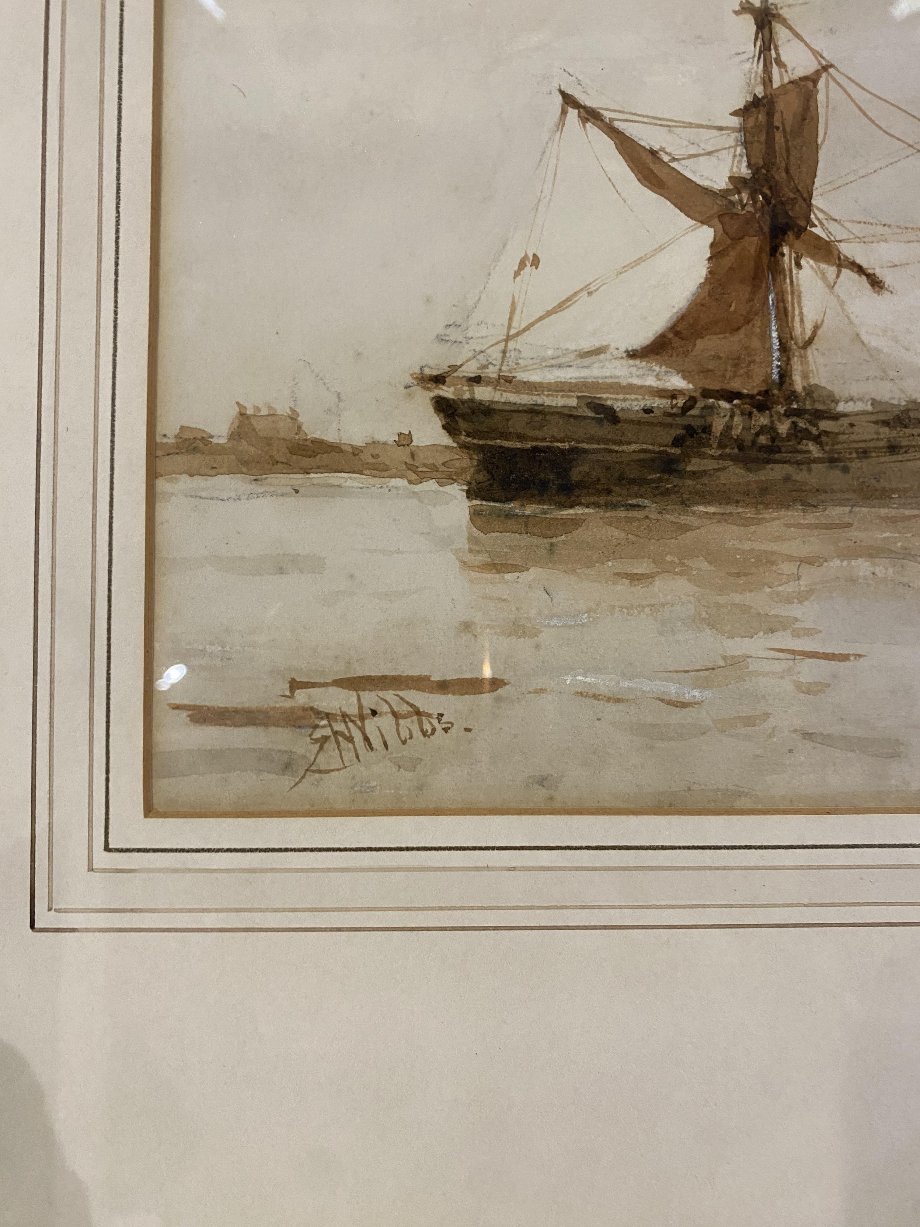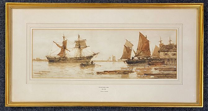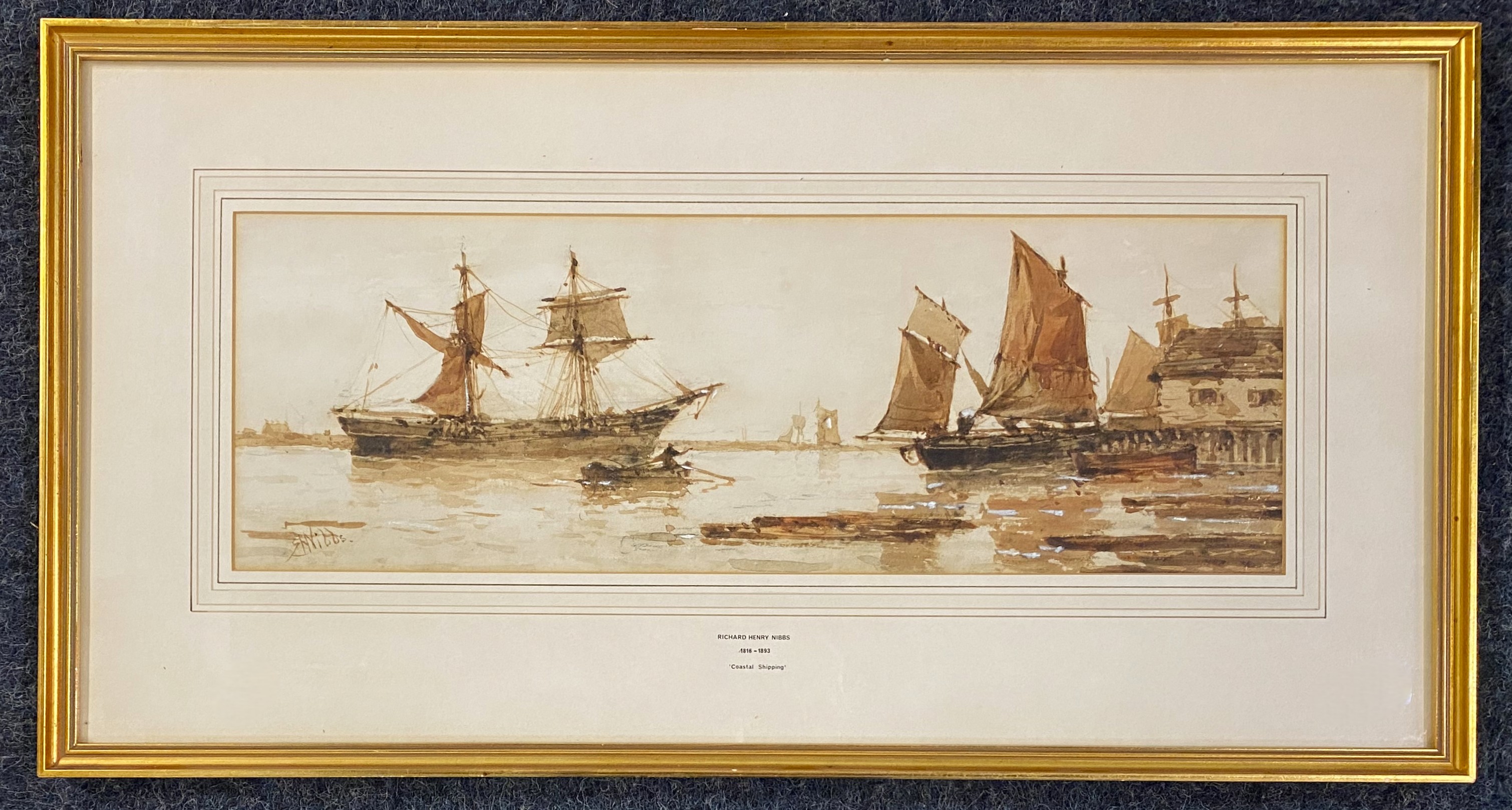 Richard Henry Nibbs (British, 1816 - 1893) 'Coastal Shipping', harbour scene, watercolour and gouache in sepia tones, signed lower left, framed, 16.5cm x 49.5cm
