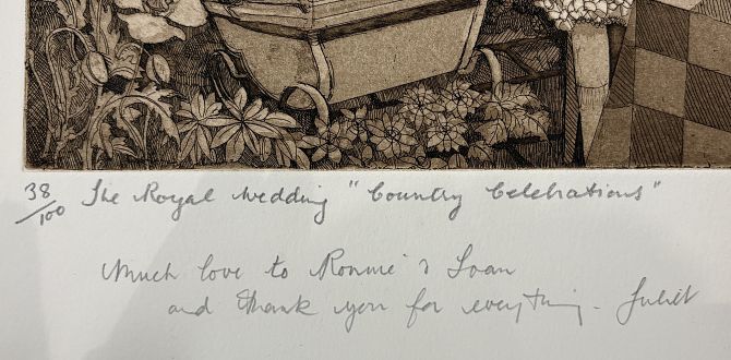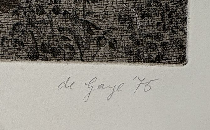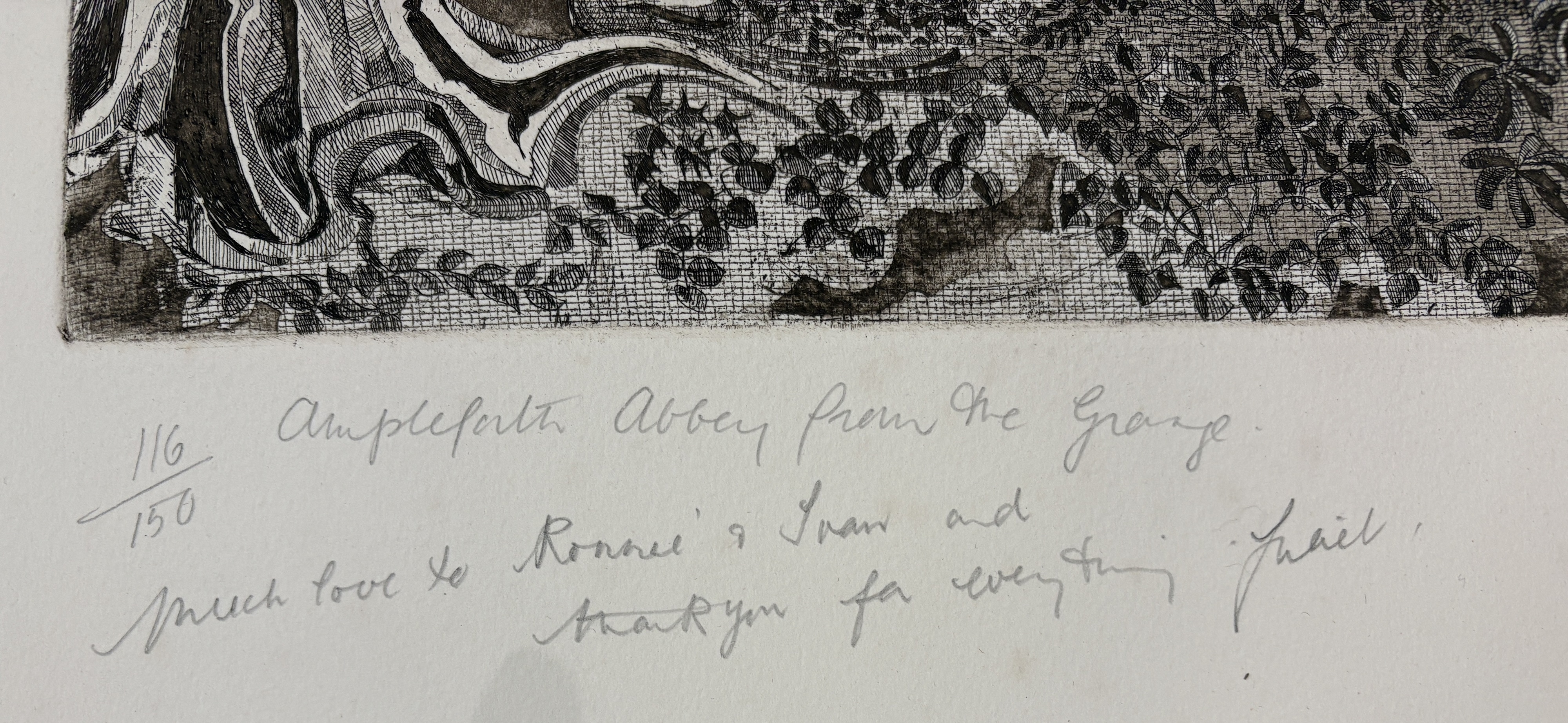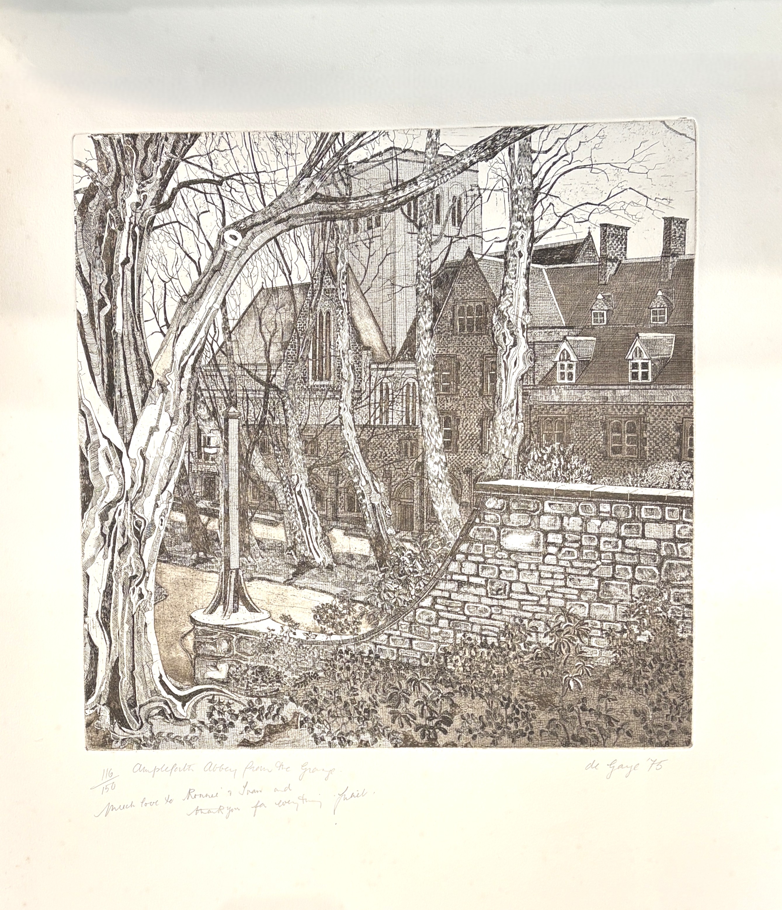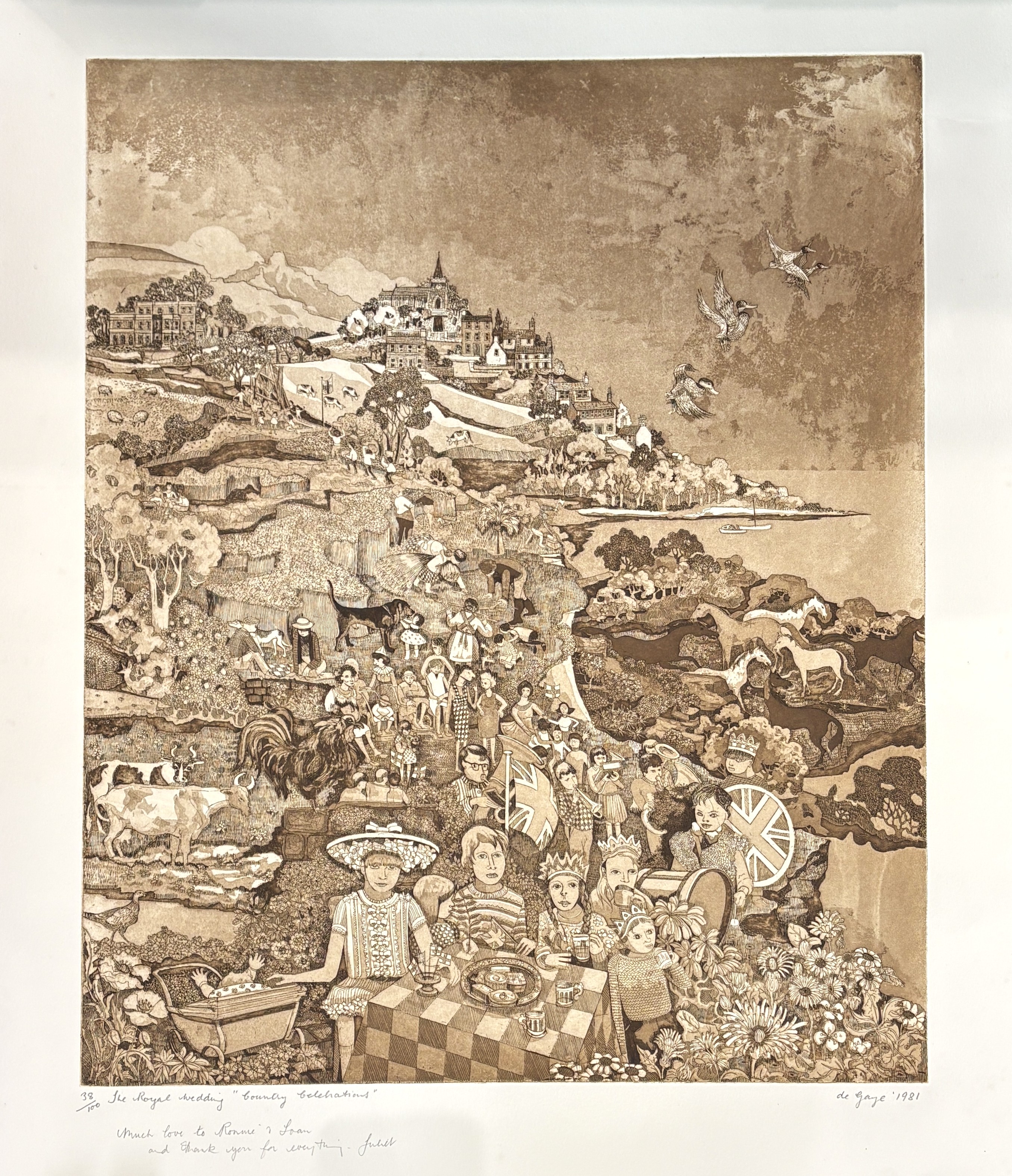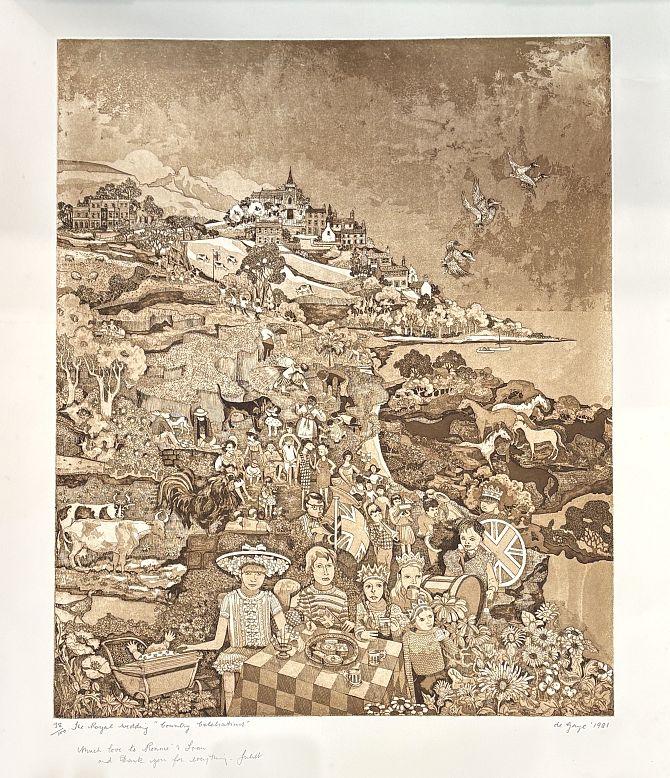 Juliet de Gaye (1930-2012), two limited edition etchings comprising 'Ampleforth Abbey from the Grange' 116/150, and 'The Royal Wedding 'Country Celebrations'' 38/100, both inscribed with personal dedication, titled, numbered and signed in pencil by the artist, 74.5cm by 57cm, unframed