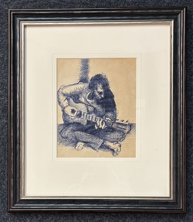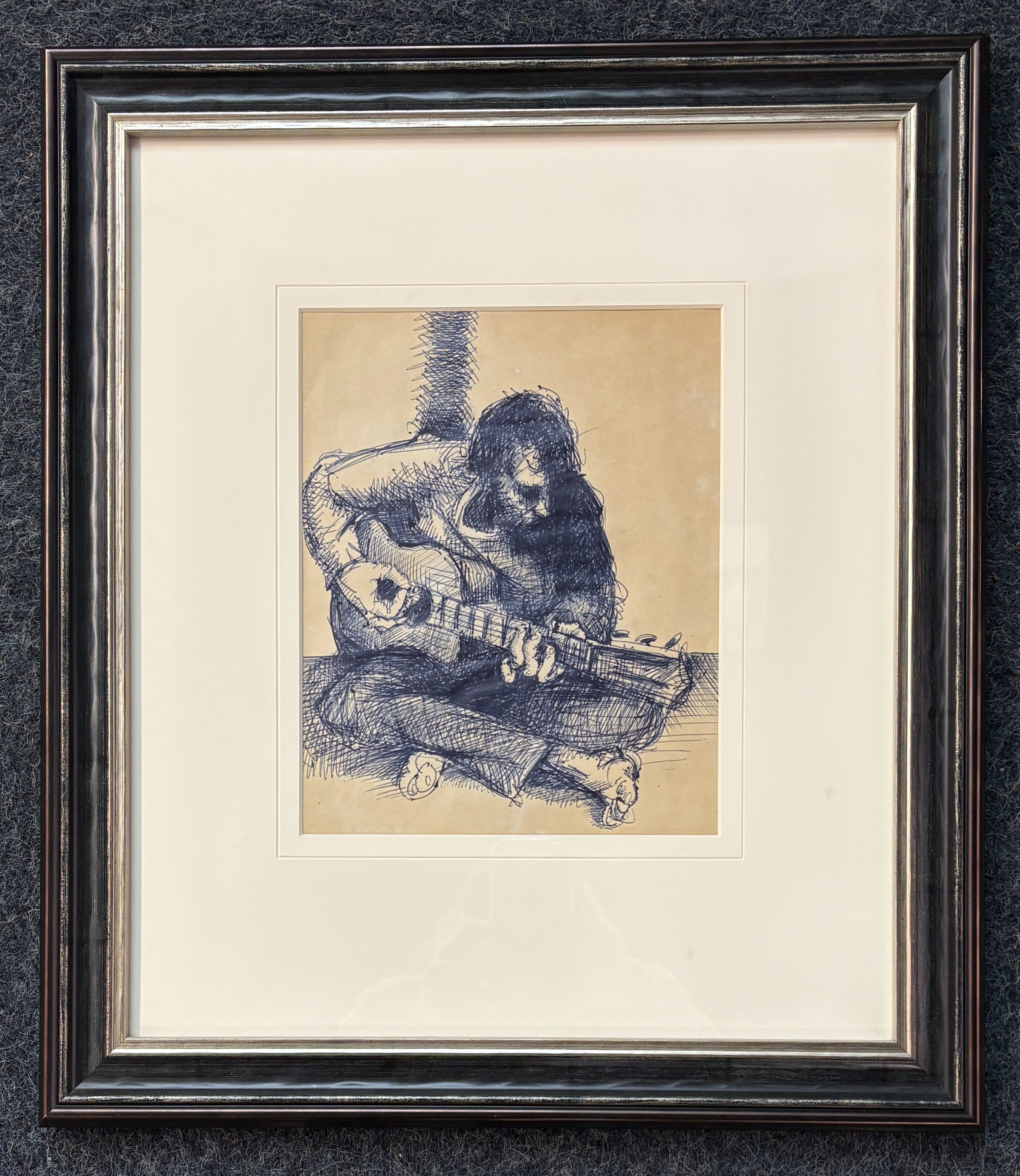 Robert Lenkiewicz (British, 1941 - 2002), 'Seated man with acoustic guitar', blue biro sketch on paper, attributed to 'Project 1 Vagrancy', 23cm by 18cm, framed. (ARR)