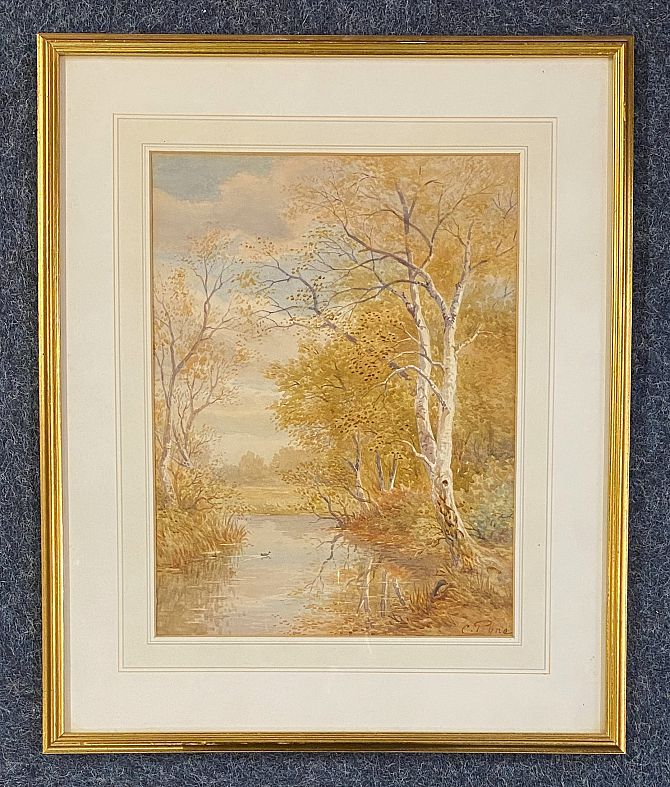 Charles Pyne (British, active 19th century) 'Autumnal Woodland Scene with River', signed lower right, framed, bearing 'Brangwyn's Studio' label verso, 34.5cm x 26cm