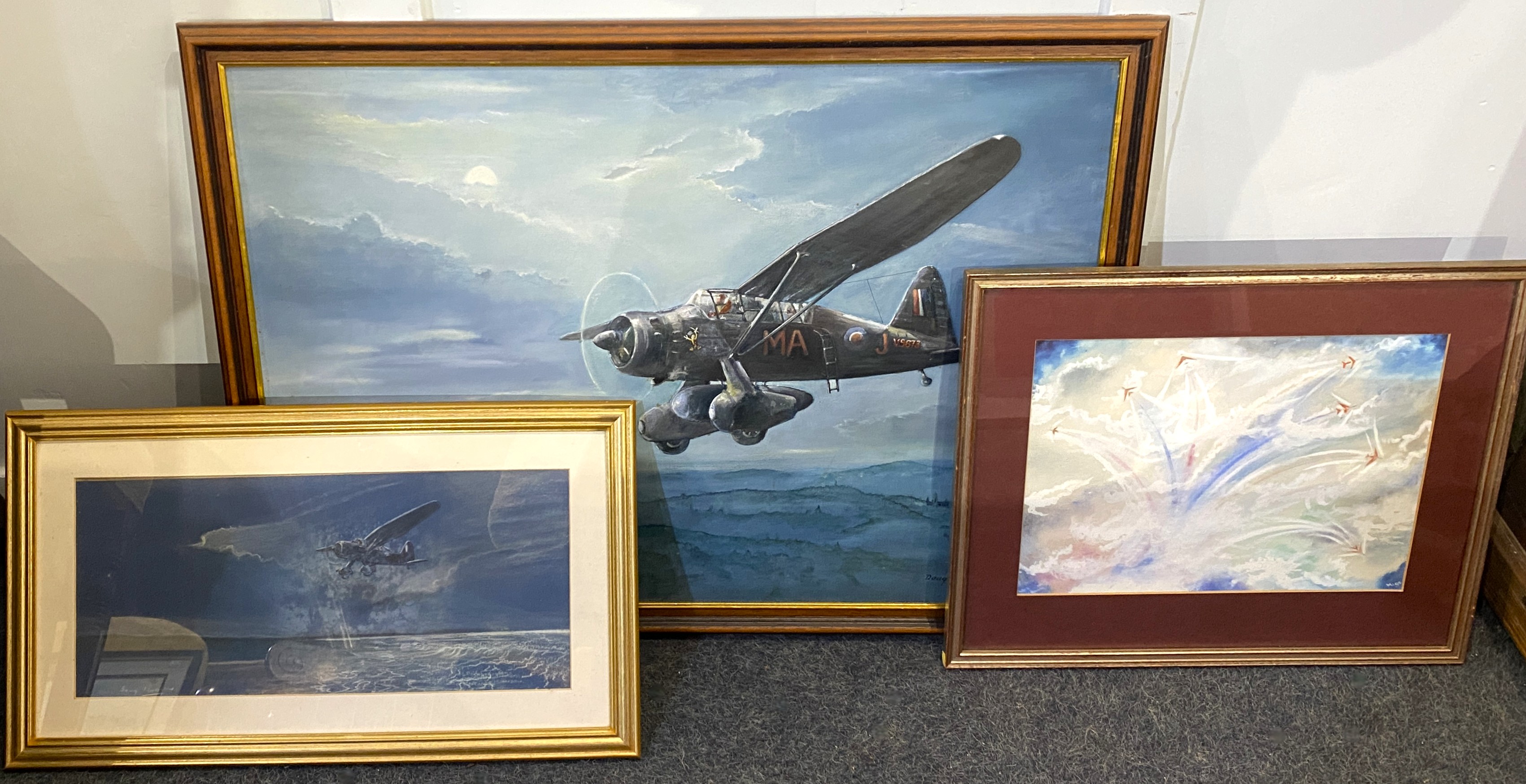 Three 20th century aviation paintings: comprising a Douglas Littlejohn oil on board, 50cm by 70cm, a Douglas Littlejohn pastel, 19cm by 42cm, framed, and a Red Arrows watercolour by Migs, 24cm by 34cm, framed, (3).