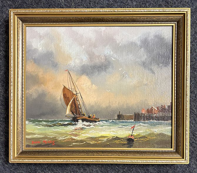 Dion Pears (1928-1985), ship sailing off a coastline, oil on board, signed, 24cm by 29cm