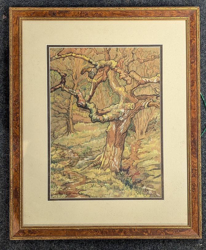 M E Hall (20th century), woodland scene with gnarled tree, watercolour and pencil, signed, 37cm by 27cm