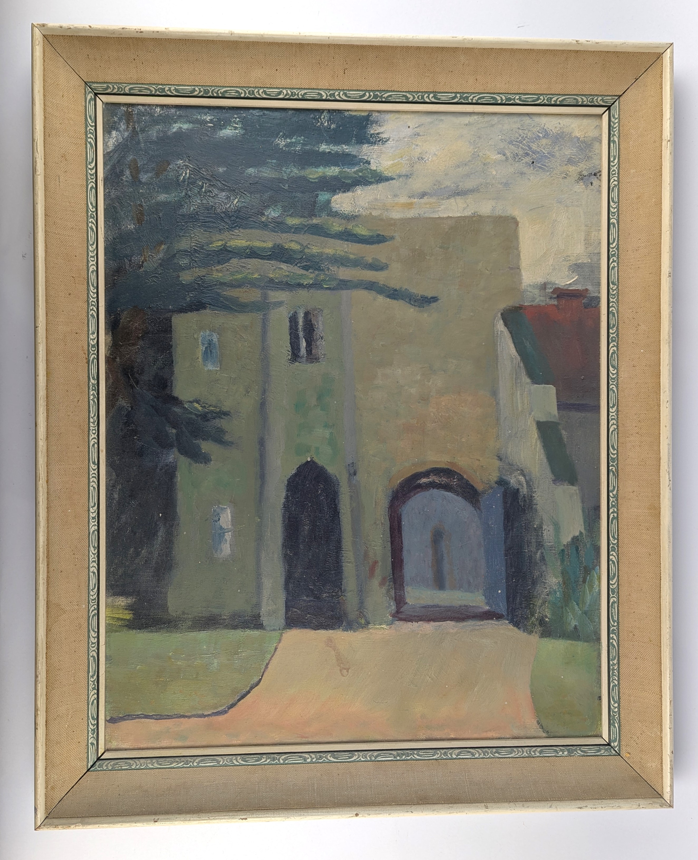 20th century school, The Bishop's Palace Gatehouse, oil on board, unsigned, verso inscribed 'H T Baille-Grohman 6 St Martins Square Chichester West Sussex', 49cm by 39cm