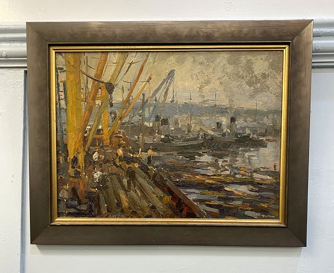 Iosif Michajlovic Gurvich (Russian 1907-1993), Unloading Timber, oil on board, signed and dated 49, 34.5cm by 49cm