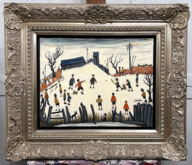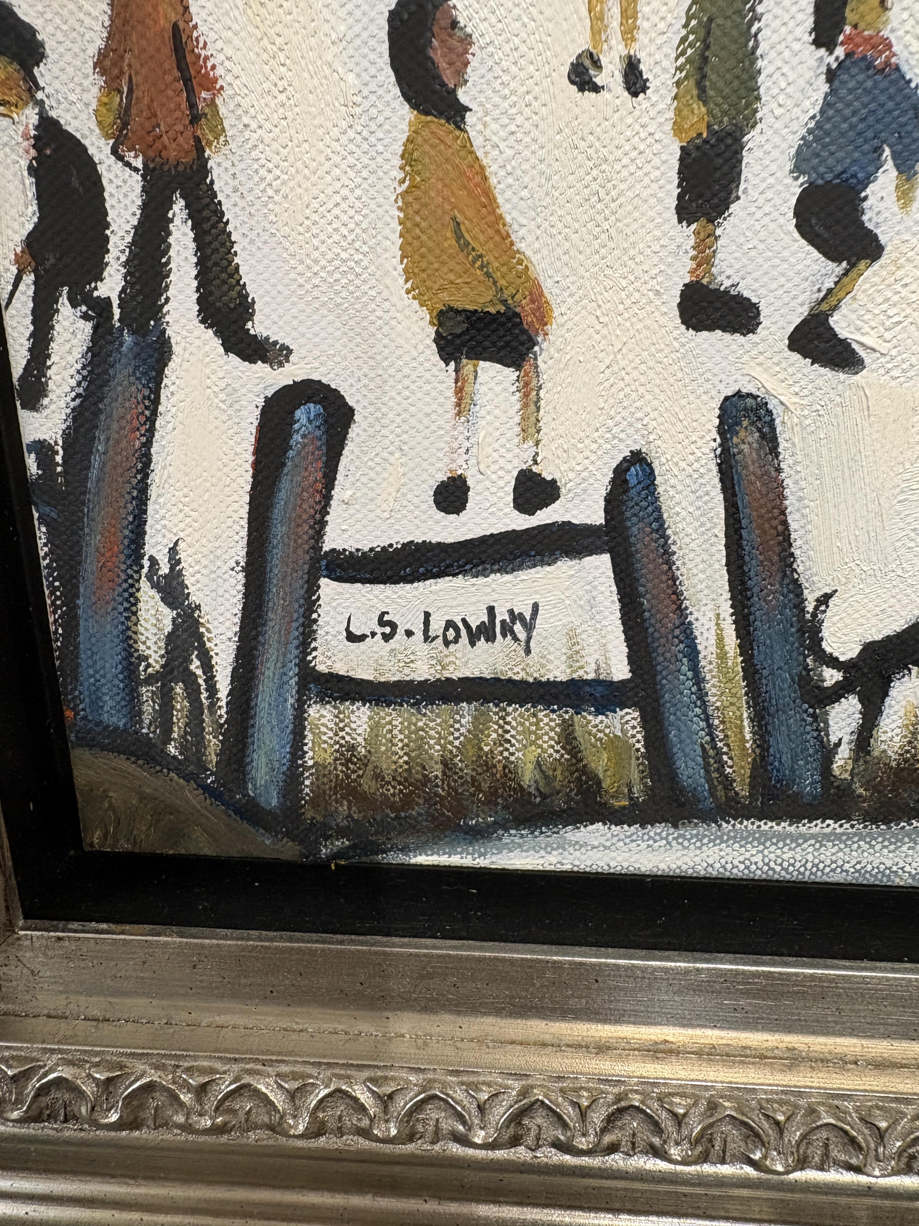 David Henty (British, b.1958 - aka the brushstroke alchemist), 'A Cricket Match' after L S Lowry (1887 - 1976), oil on canvas, bears a pseudo Lowry signature lower left and artists signature verso, 37cm by 47cm, framed. (ARR)