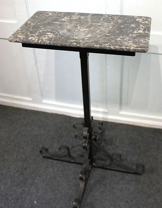 A rectangular marble top plant stand on black painted metal scroll supports height 80cm, width 50cm, depth 28cm