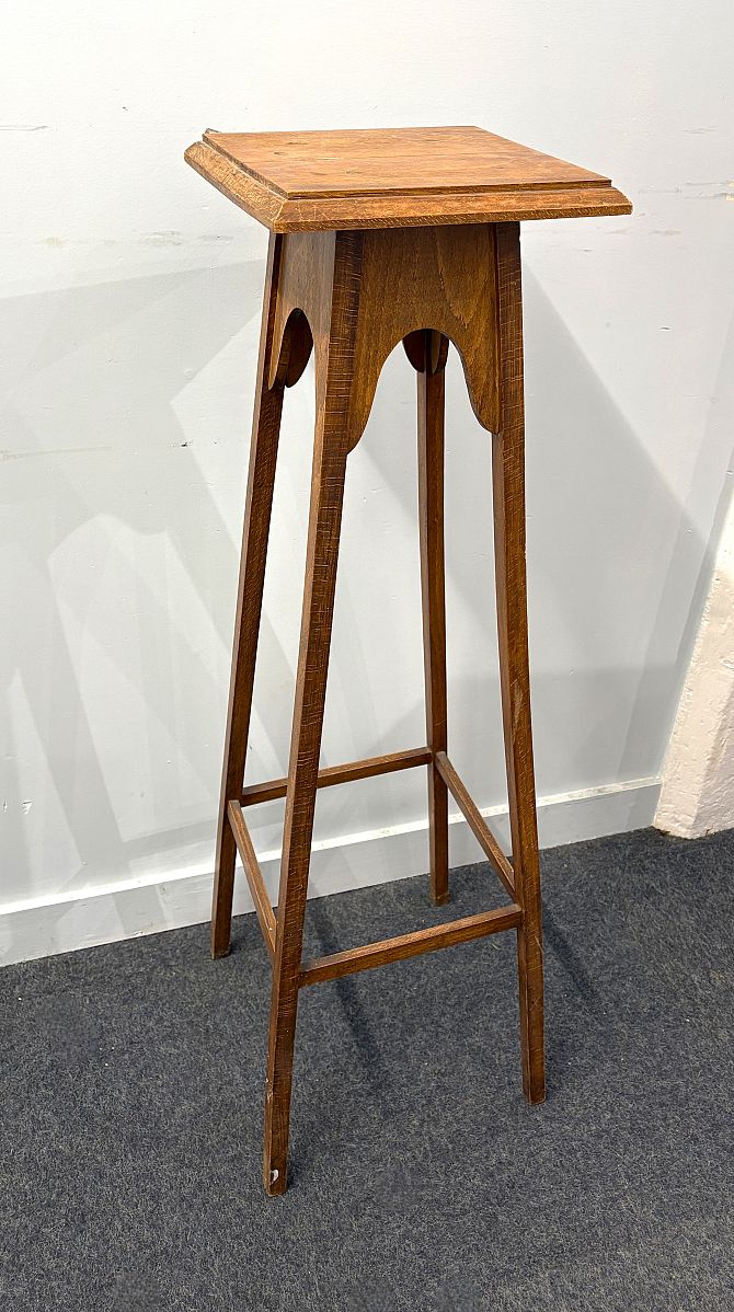 An Arts & Crafts style oak jardiniere stand with rectangular top on splayed square supports with uniting stretcher height 105cm, top 26cm wide and 28cm deep