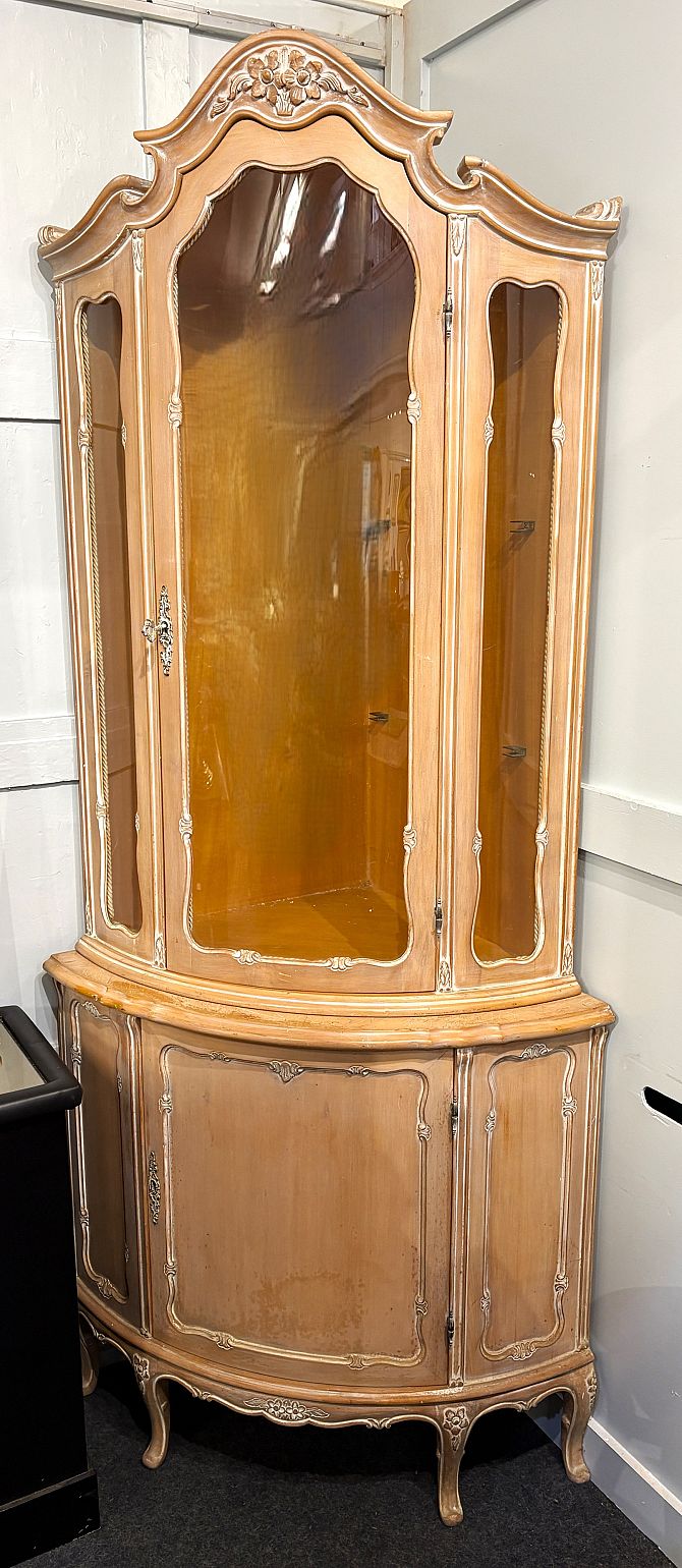 A French paint-effect bow front tall corner cabinet, in the Louis XV style, 20th century, 206cm high by 92cm wide.