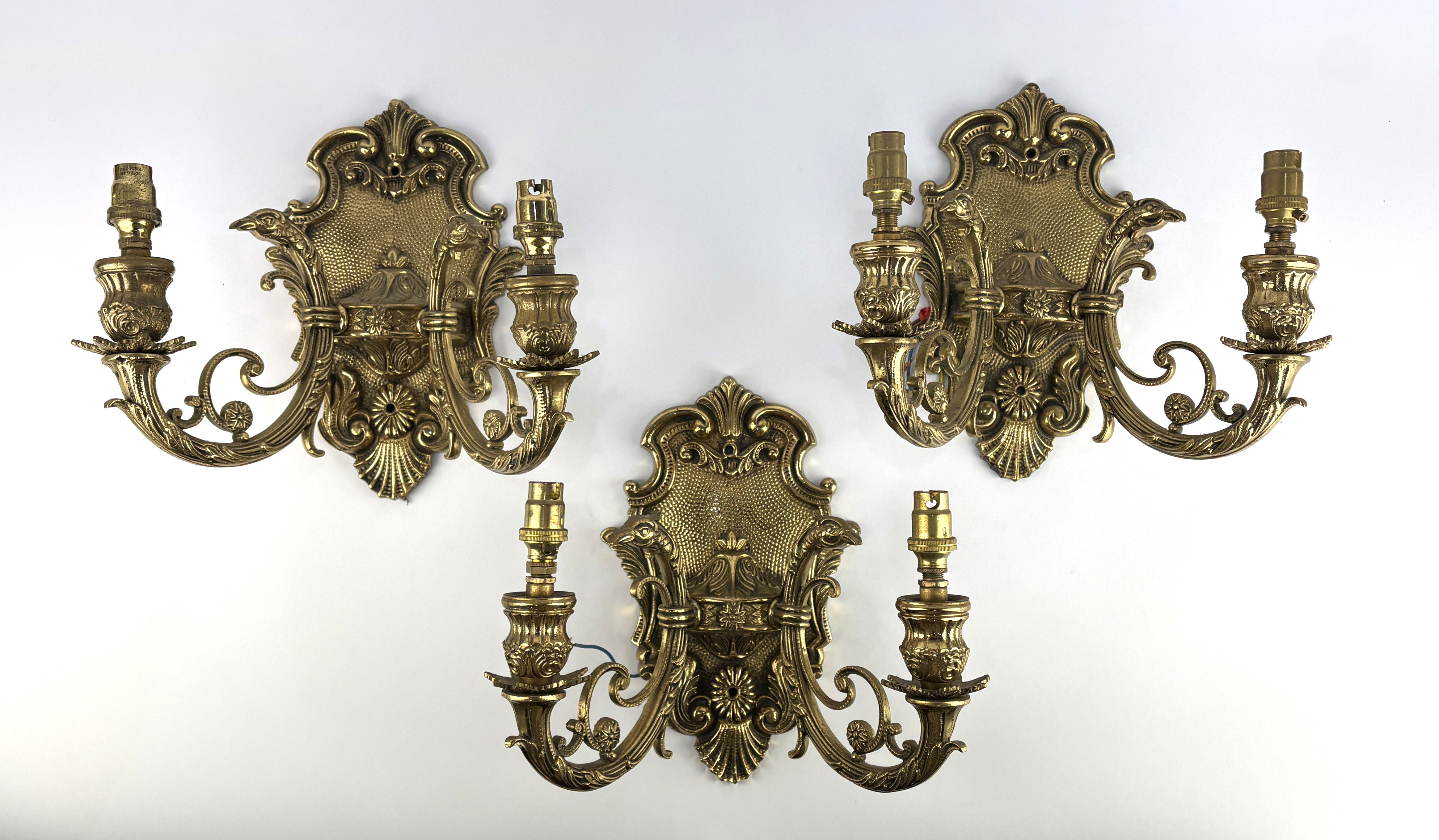 A set of three gilt brass two light wall sconces, Rococco style, each with twin branch arm with terminal in the form of a peacock/ bird's head, wall mount with scallop shell motif, height overall 24cm
