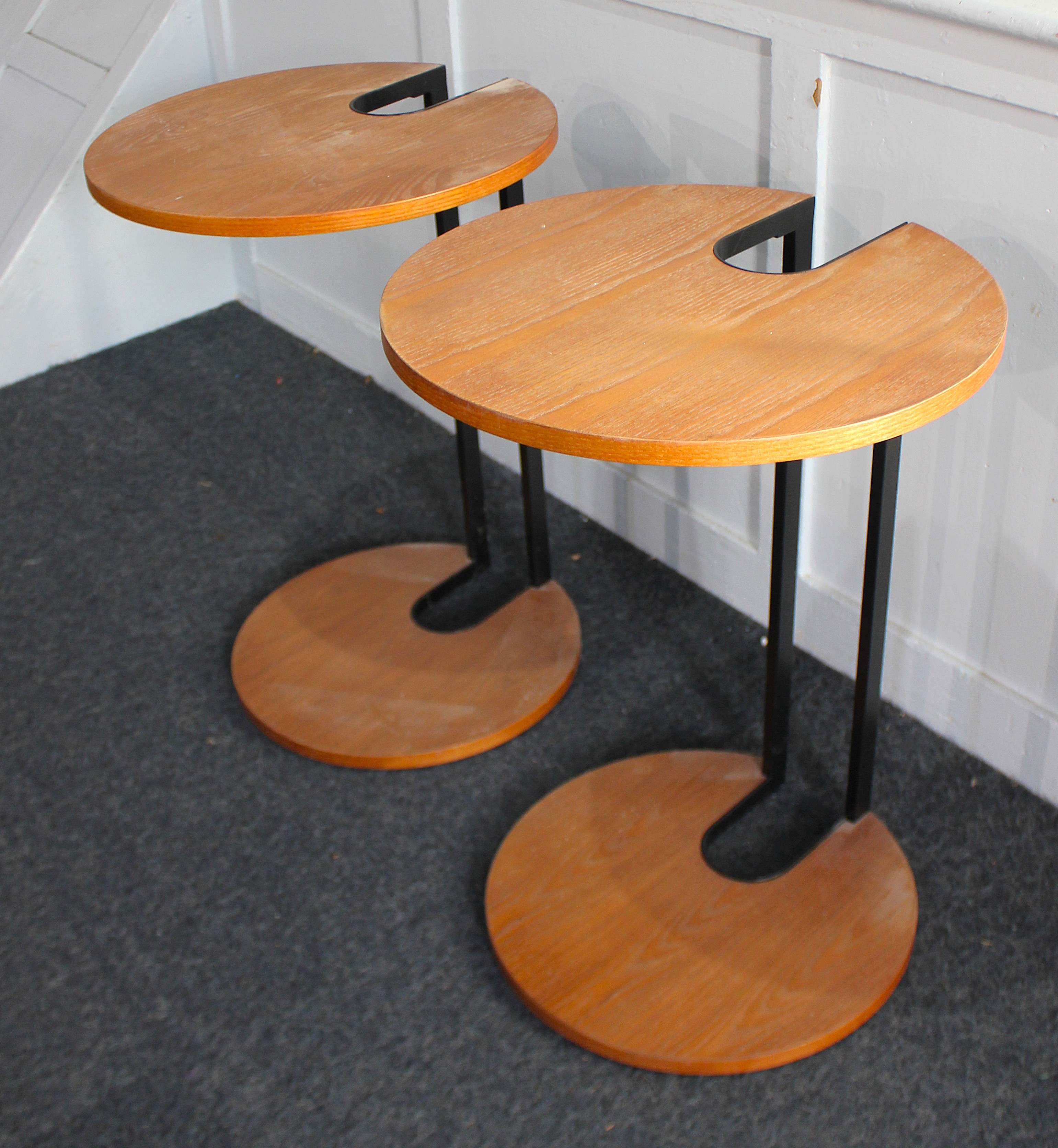 A pair of contemporary wood and metal side tables, 46cm diameter by 65cm high.