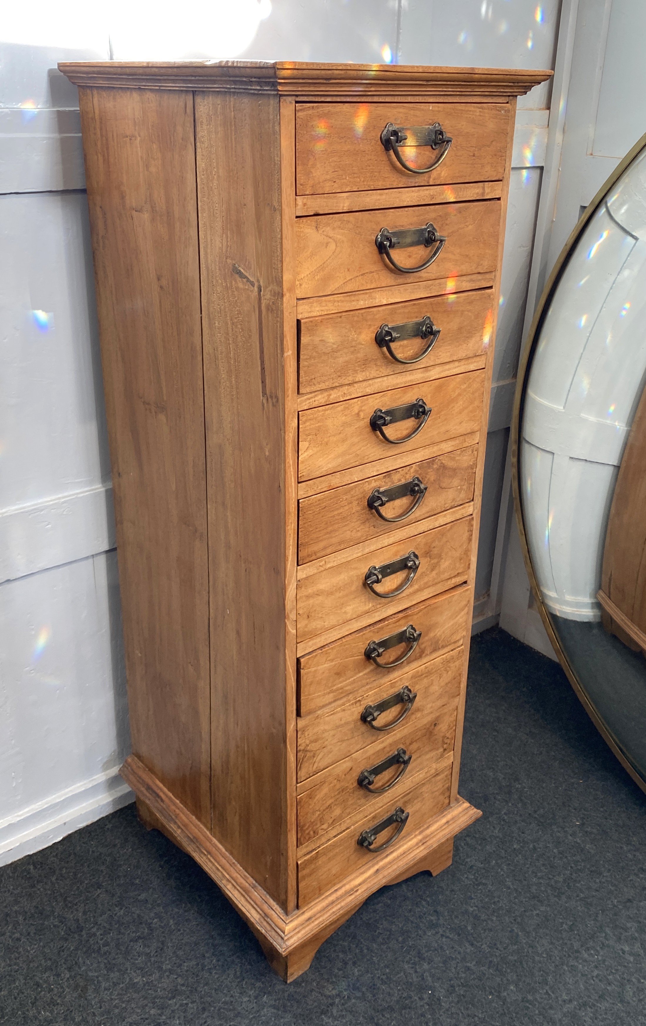 A hardwood narrow chest of ten drawers, 20th century, raised on bracket feet, 41cm wide by 125cm high by 47cm deep.
