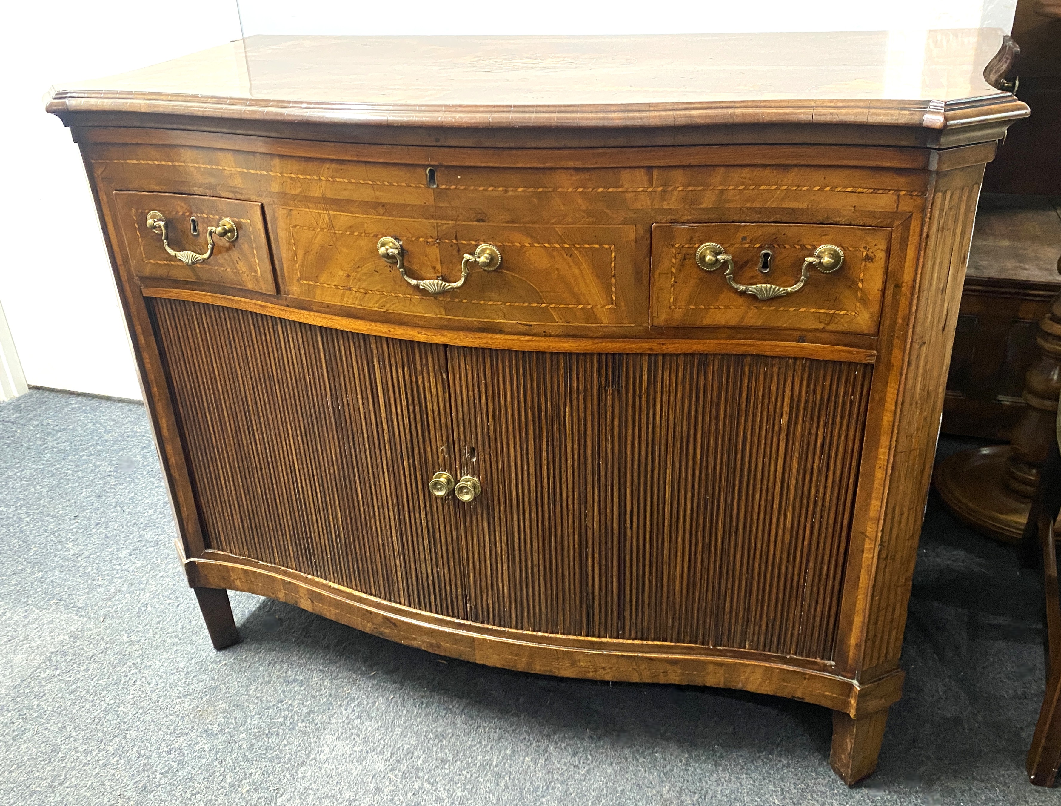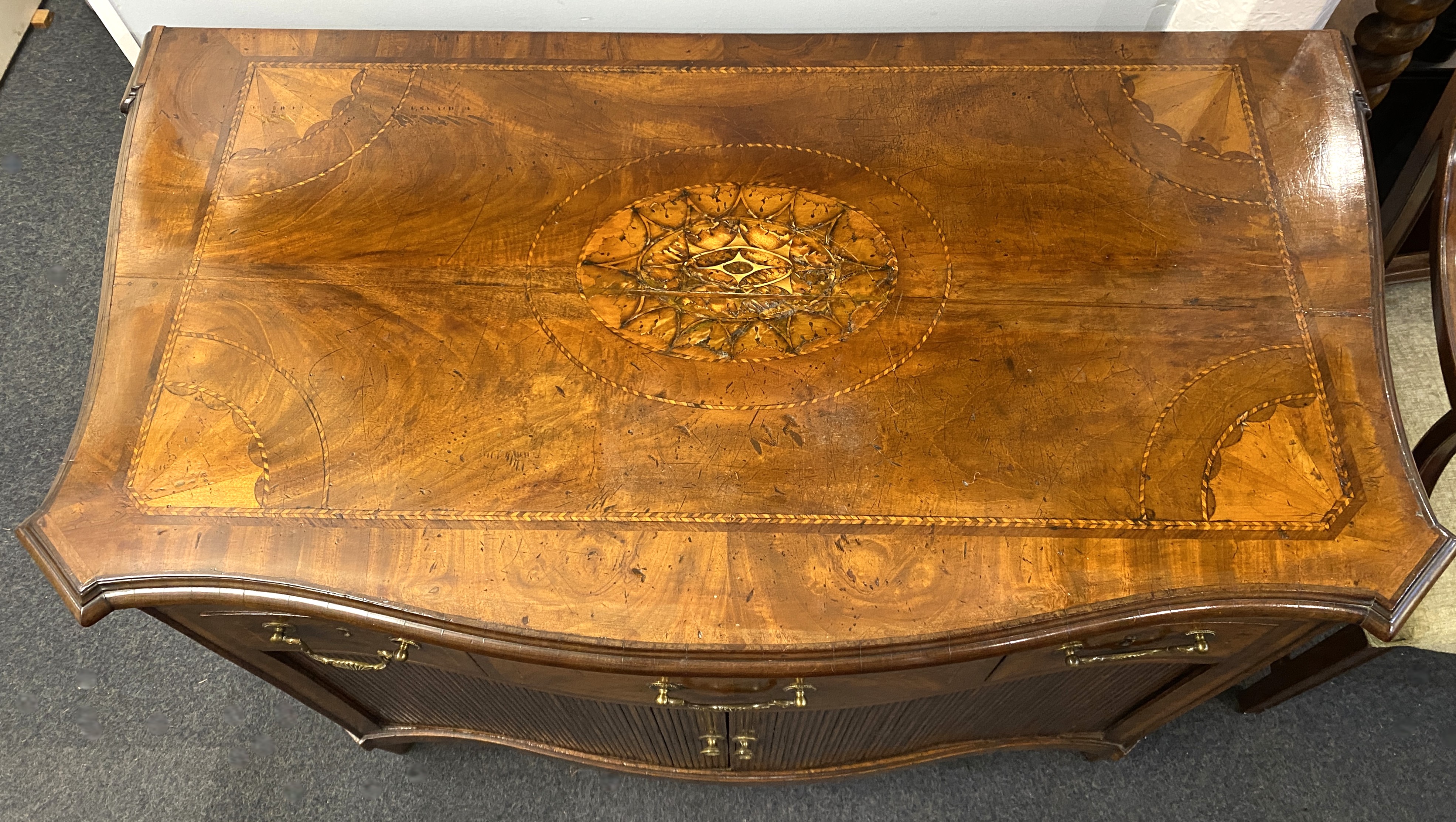A gentleman's 18th century Dutch mahogany inlaid enclosed serpentine wash stand with oval satinwood panelled lifting top enclosing recess for bowl, two shelves and two pull-out side slides with two real and a dummy drawer above cupboard, enclosed by two tambour doors and satinwood 'line' canted corners on short tapered legs, width 120cm, height 86cm, depth 62cm