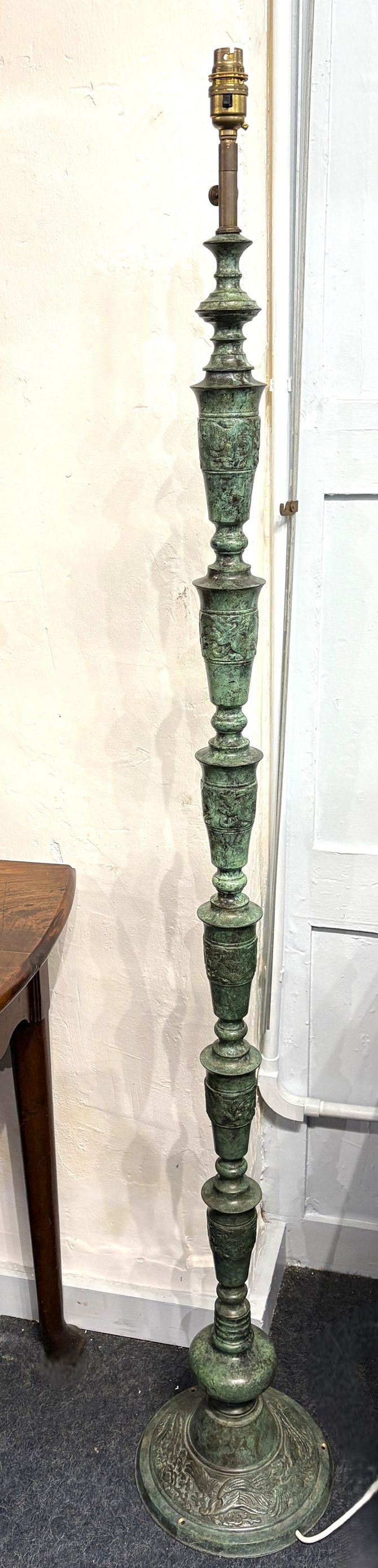 A 20th century metal standard lamp with verdigris-effect finish, 149cm high including fittings