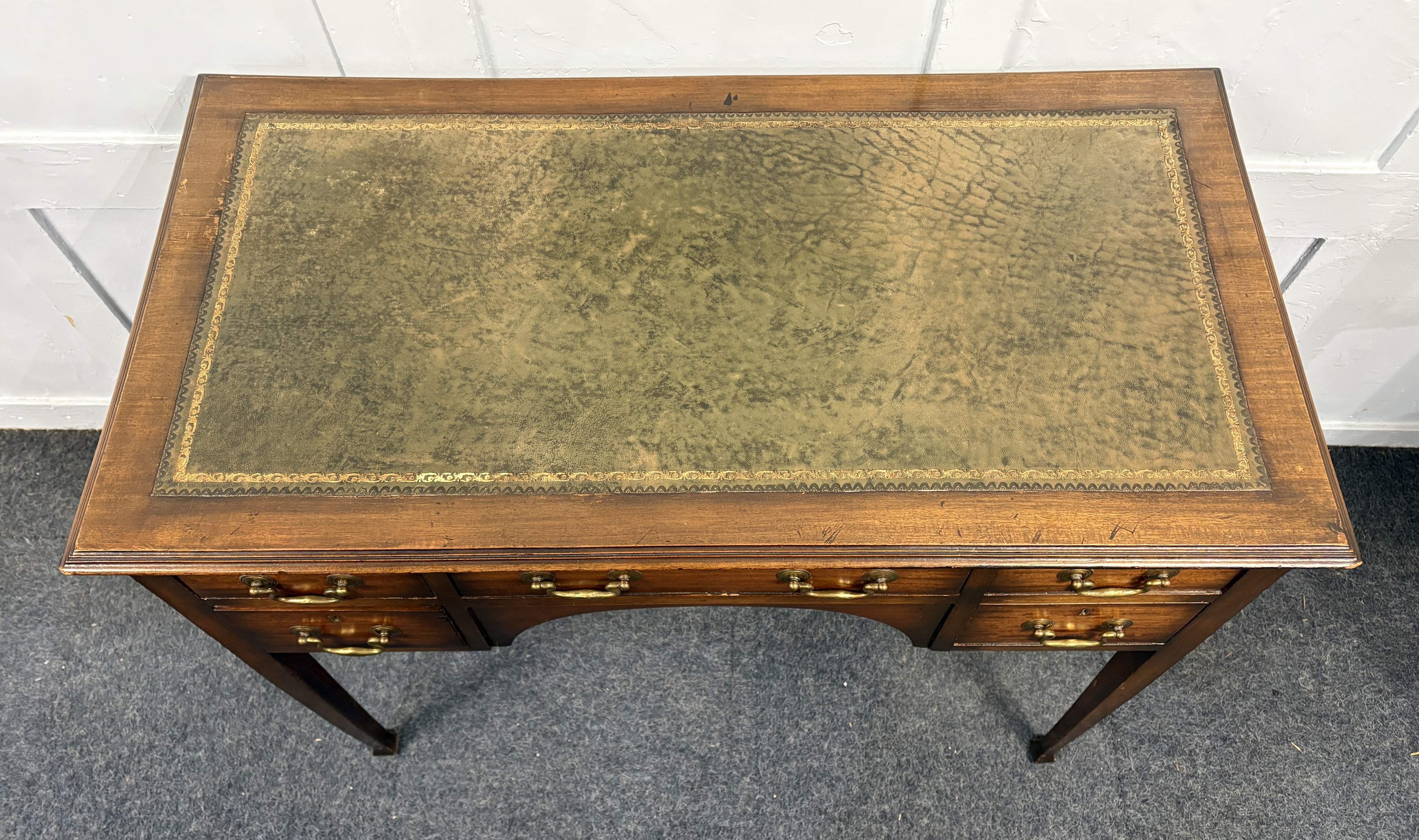 A Georgian Revival mahogany kneehole desk with leather inset rectangular top above an arrangement five drawers on square tapered legs height 77cm, width 99cm, depth 52cm