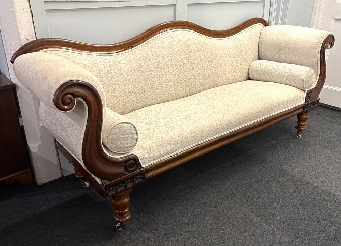 A Victorian scroll end sofa with pale cream leaf patterned upholstery, scroll and floral carved frame, the shaped toprail above shaped and scrolled arm supports, on turned legs and ceramic castors, 92cm high, 220cm wide, 61cm deep