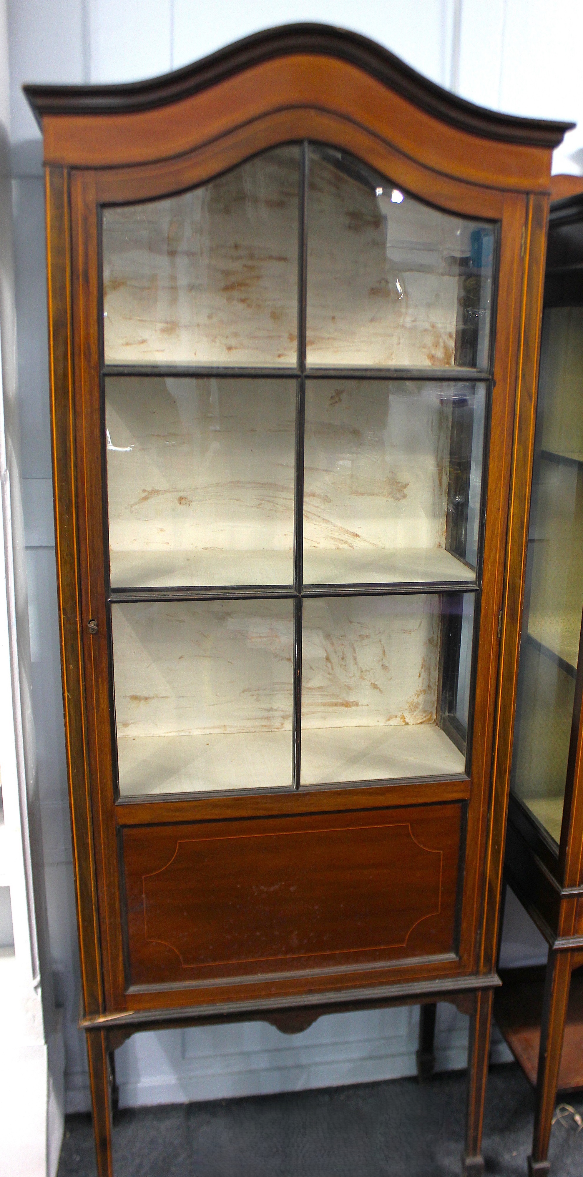An Edwardian inlaid mahogany display cabinet with boxwood stringing and domed top, the glass panelled door enclosing a lined fitted interior, raised on tapered square supports terminating on spade feet, 69cm wide by 180cm high by 33cm deep.