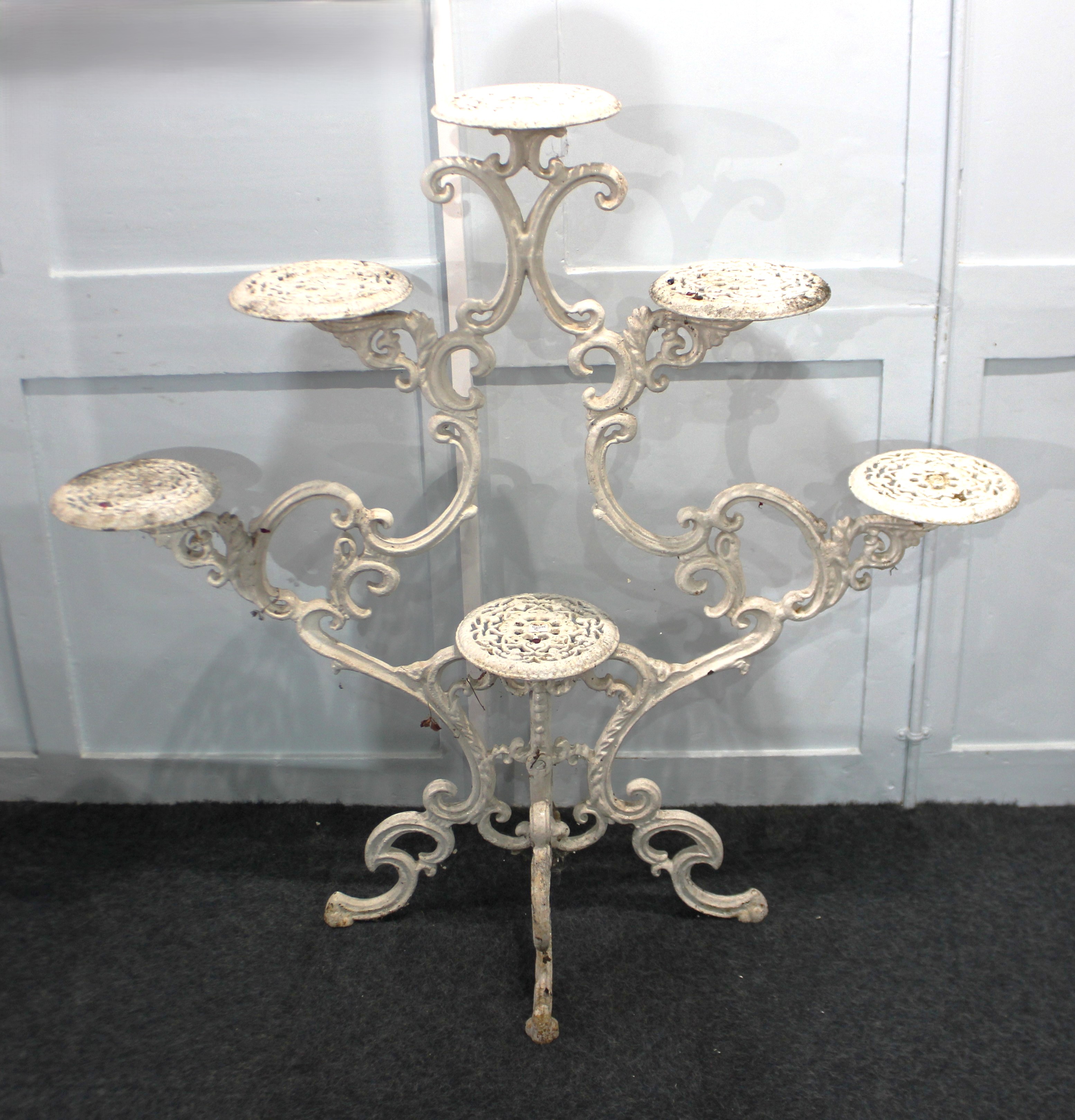 A Victorian style white painted cast iron plant stand, with pierced circular platforms, height 108cm