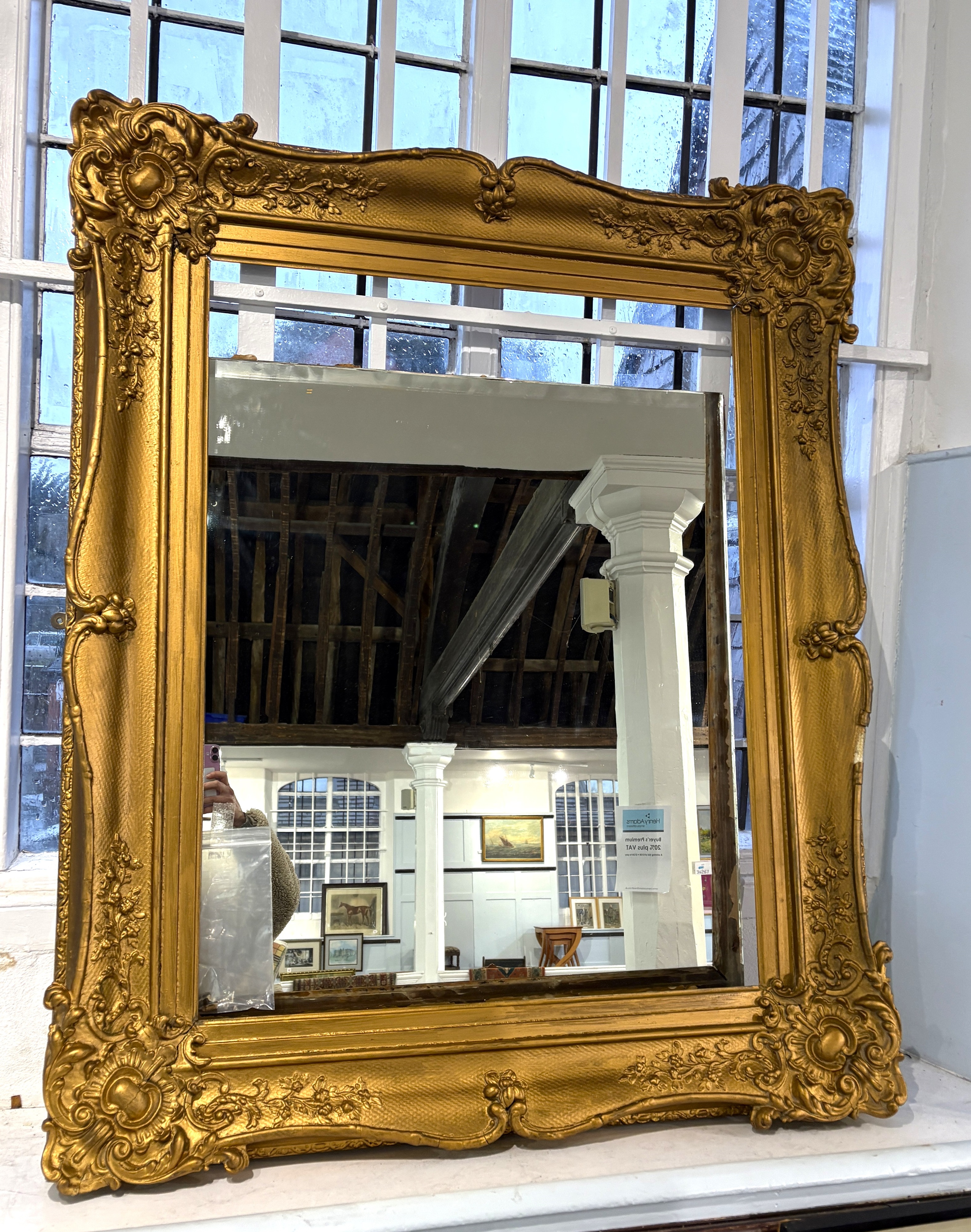 A large 19th century gilt gesso wall mirror or picture frame, with modern back and mirror plate, overall size 120cm by 100cm, aperture 88cm by 68cm.