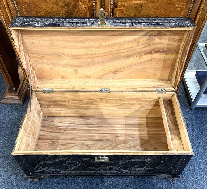 A Chinese carved stained camphor wood chest profusely decorated with animals amongst flowers and foliage, height 48cm, width 94cm, depth 44cm