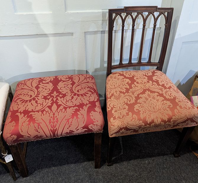 A small foot stool with red damask upholstered top, together with a Sheraton style dining / side chair with similar upholstery