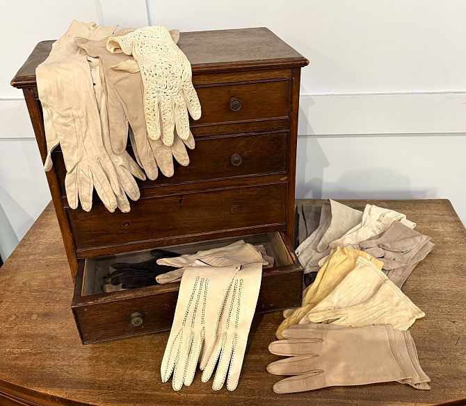 A small mahogany collector's chest of two short over three long drawers height 41.5cm, width 41.5cm, depth 23cm, together with a collection of antique leather gloves (a/f)