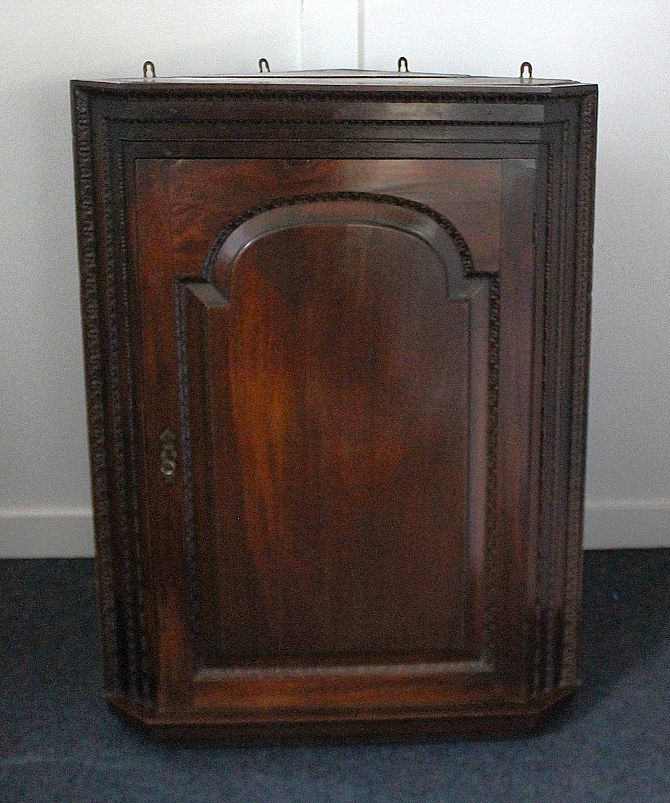 A Georgian carved mahogany corner cupboard with panel door enclosing shelves, height 96cm, width 75cm, depth 44cm