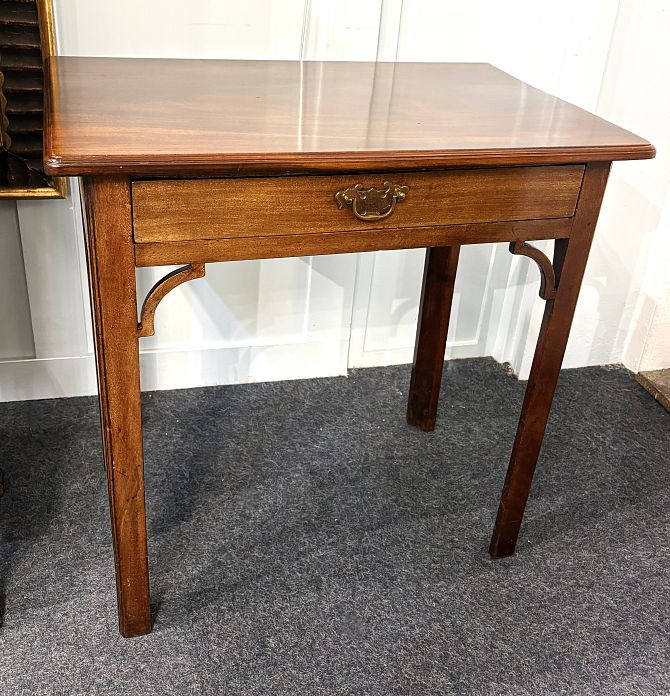 A small 18th century walnut side table, with single frieze drawer, inner chamfered supports and pierced brackets, 71cm wide by 45cm 72cm high.
