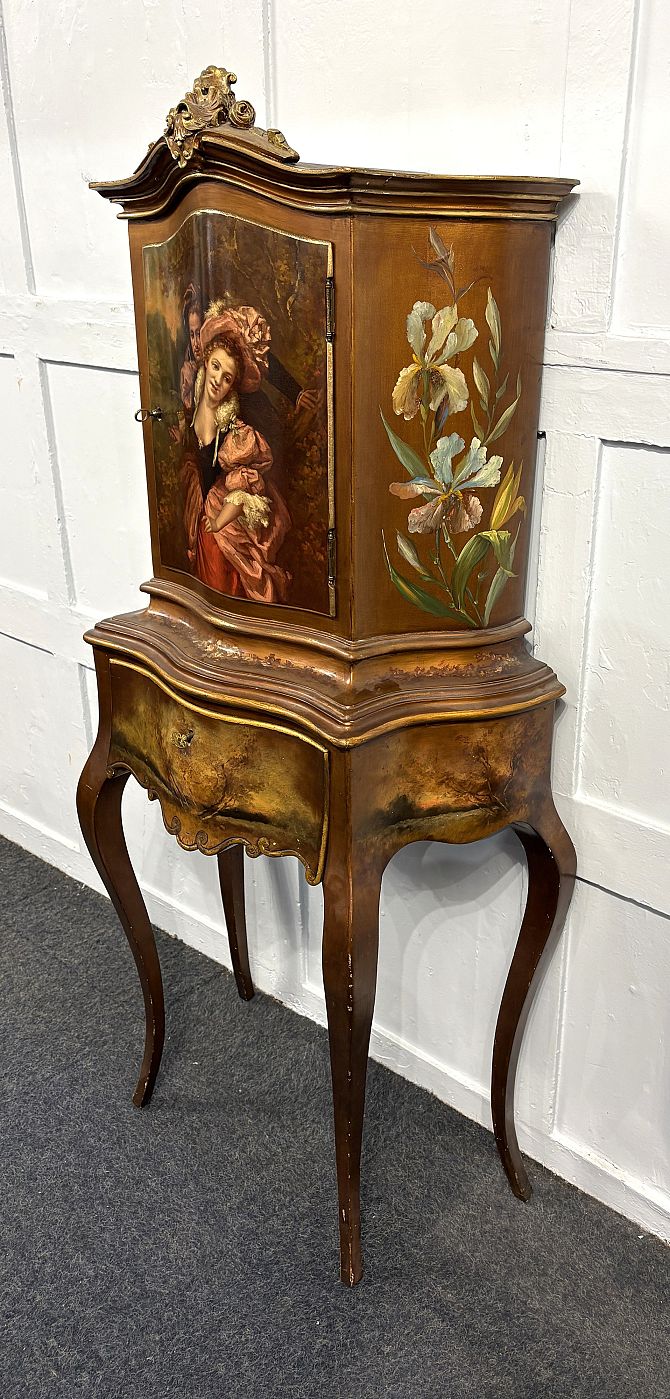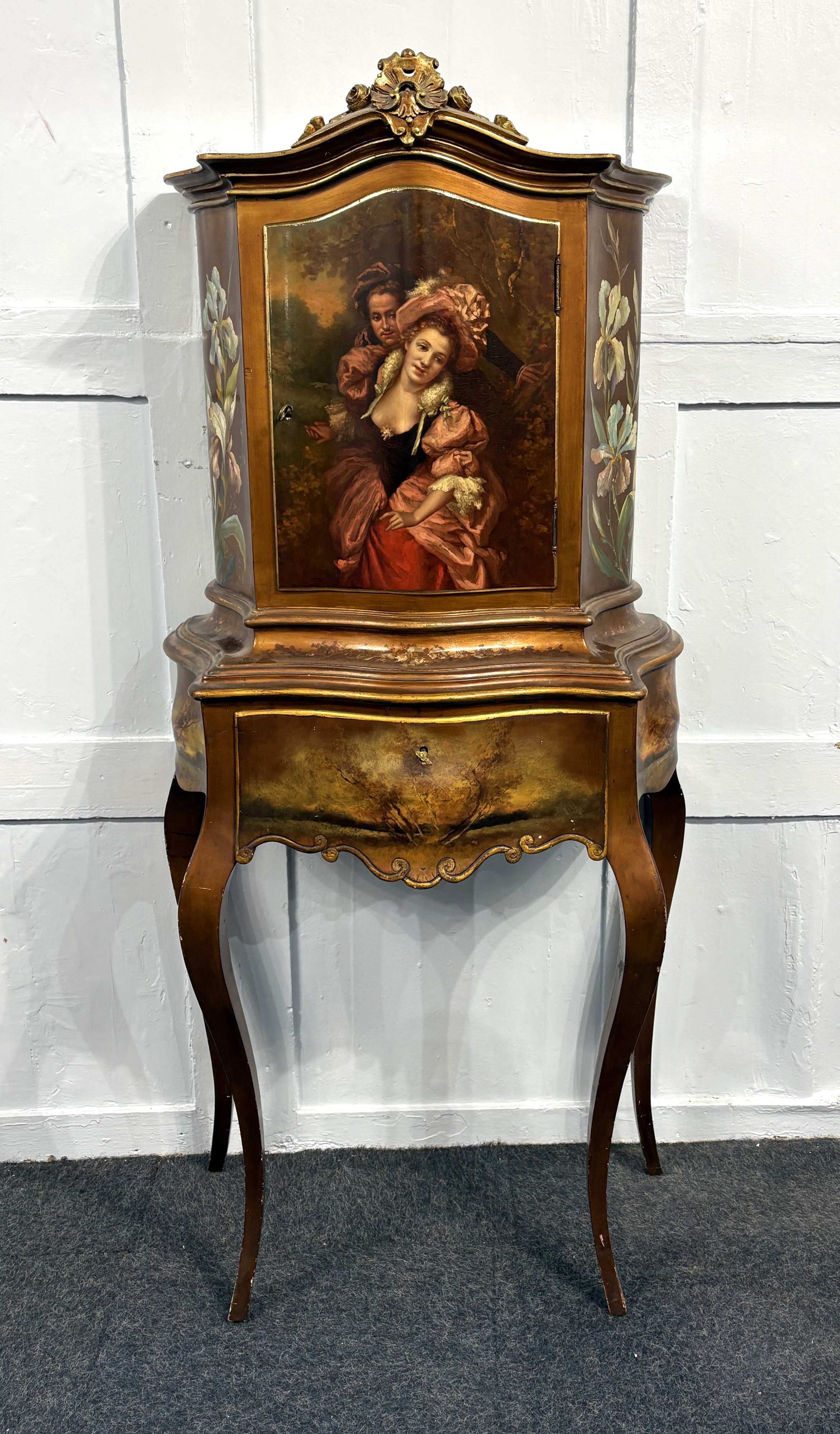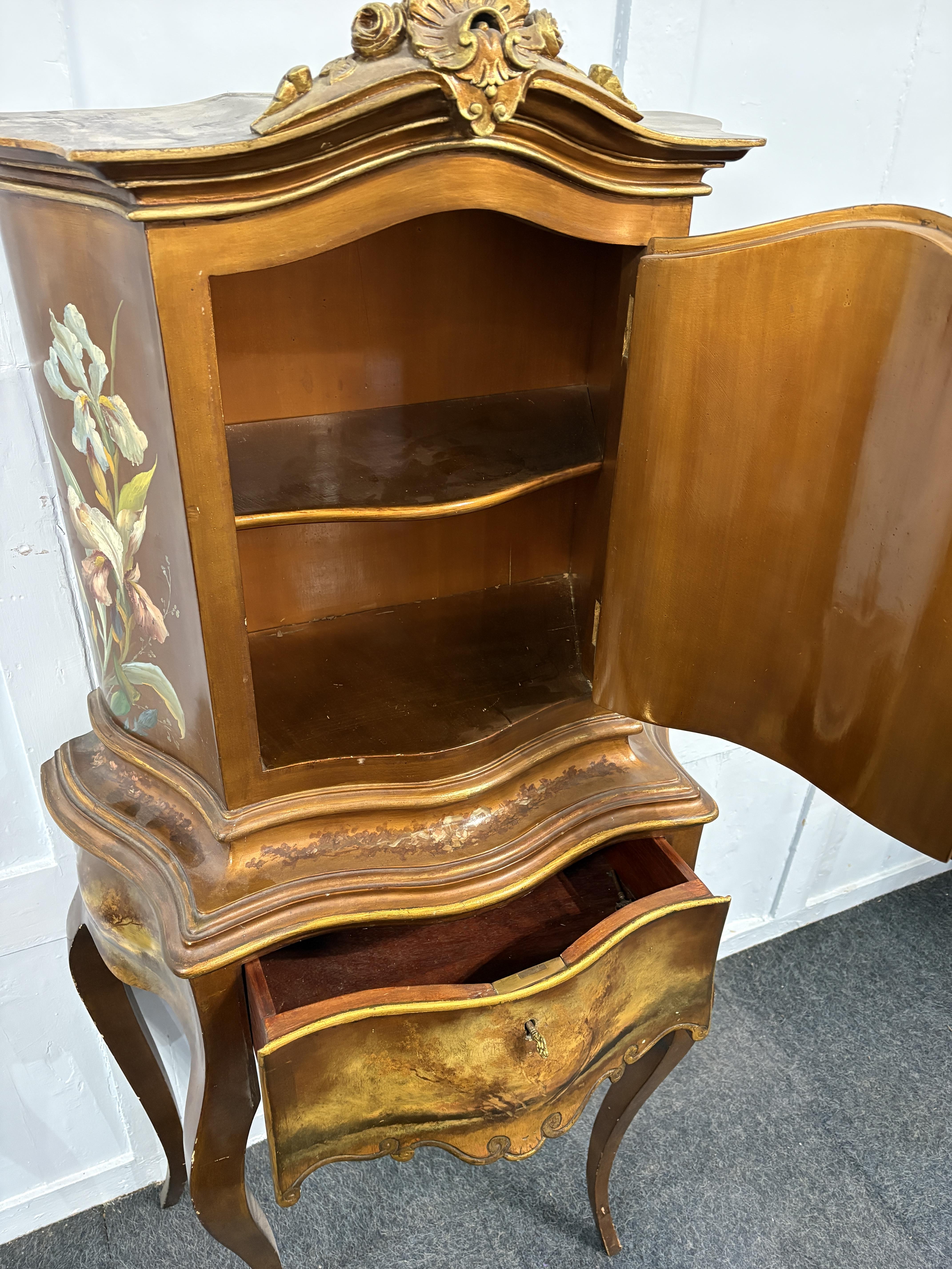 A vintage French bombe shaped side cabinet in the style of Vernis Martin, (20th century), fitted with a single door enclosing shelf, above a single drawer, raised on four tapered ogee supports, 144cm high by 66cm wide.