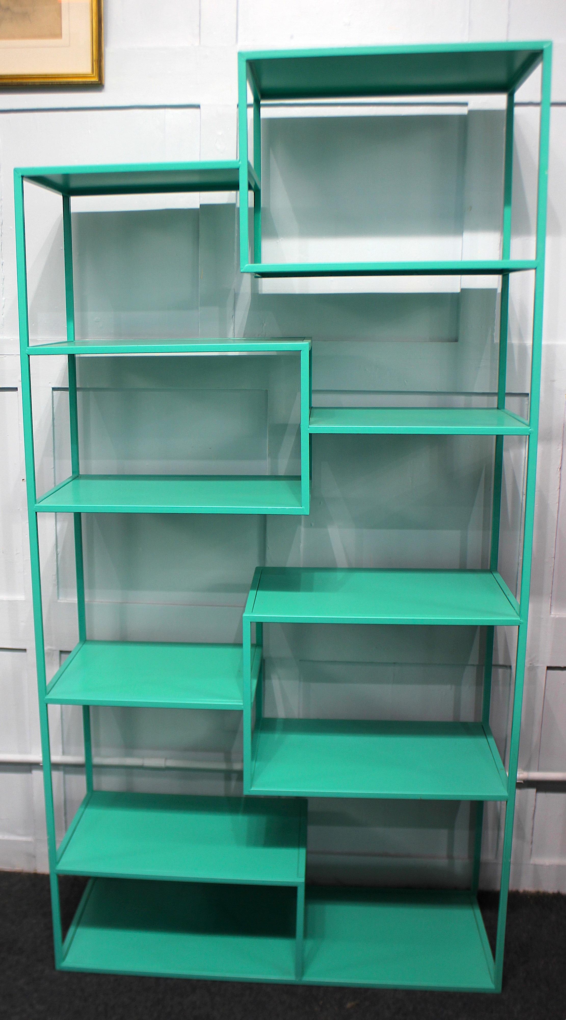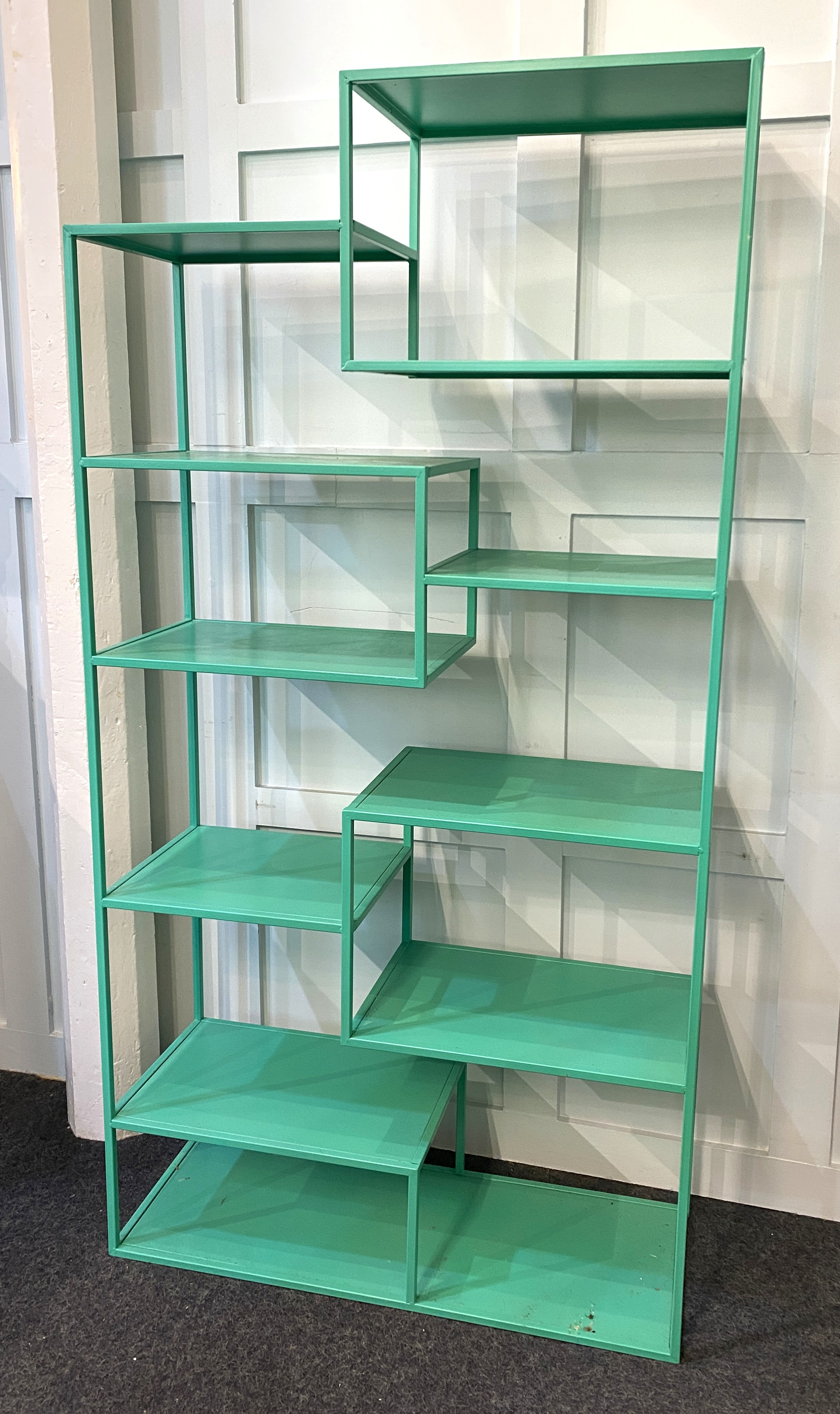A green finished metal display stand in the Chinese style, 85cm wide by 165cm high by 32cm deep.