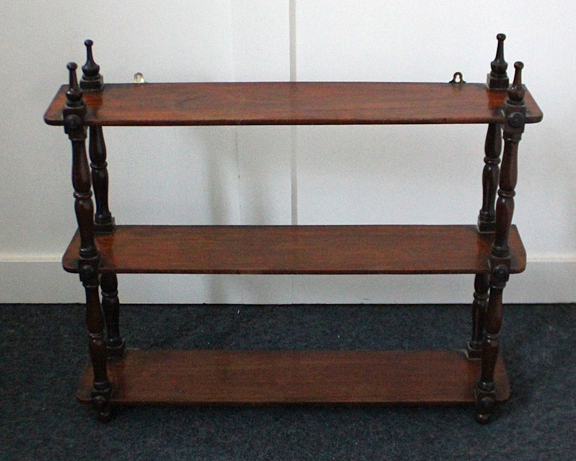 A late 19th century mahogany wall mounted set of three shelves, turned supports with finials and rectangular shelves, height 60cm, 69cm wide