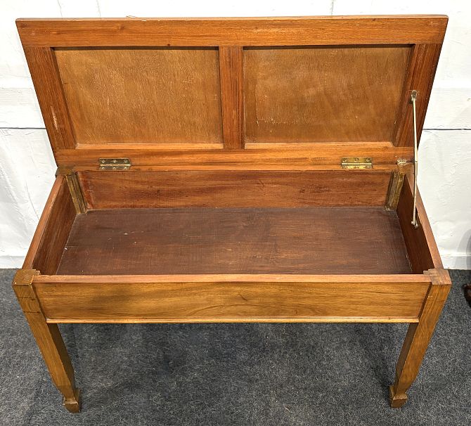 An early 20th century mahogany two-seater piano stool the hinged seat with needlework upholstered top, on square legs to spade feet height 50cm, length 78cm, depth 34cm