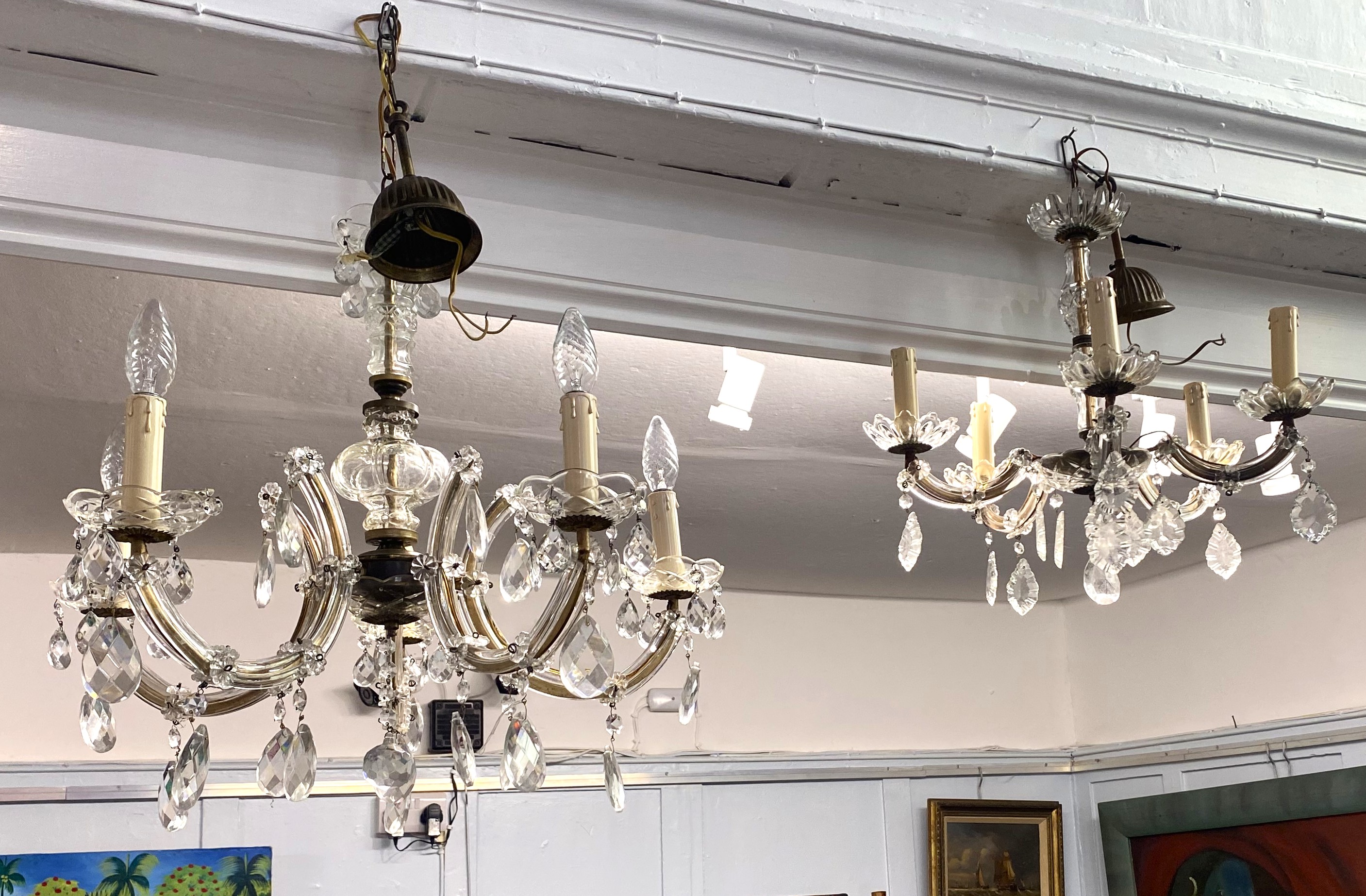 A cut glass five branch chandelier with applied floral motifs and suspending drops, height approximately 52cm excluding chain, and a similar smaller example height approx 39cm excluding chain
